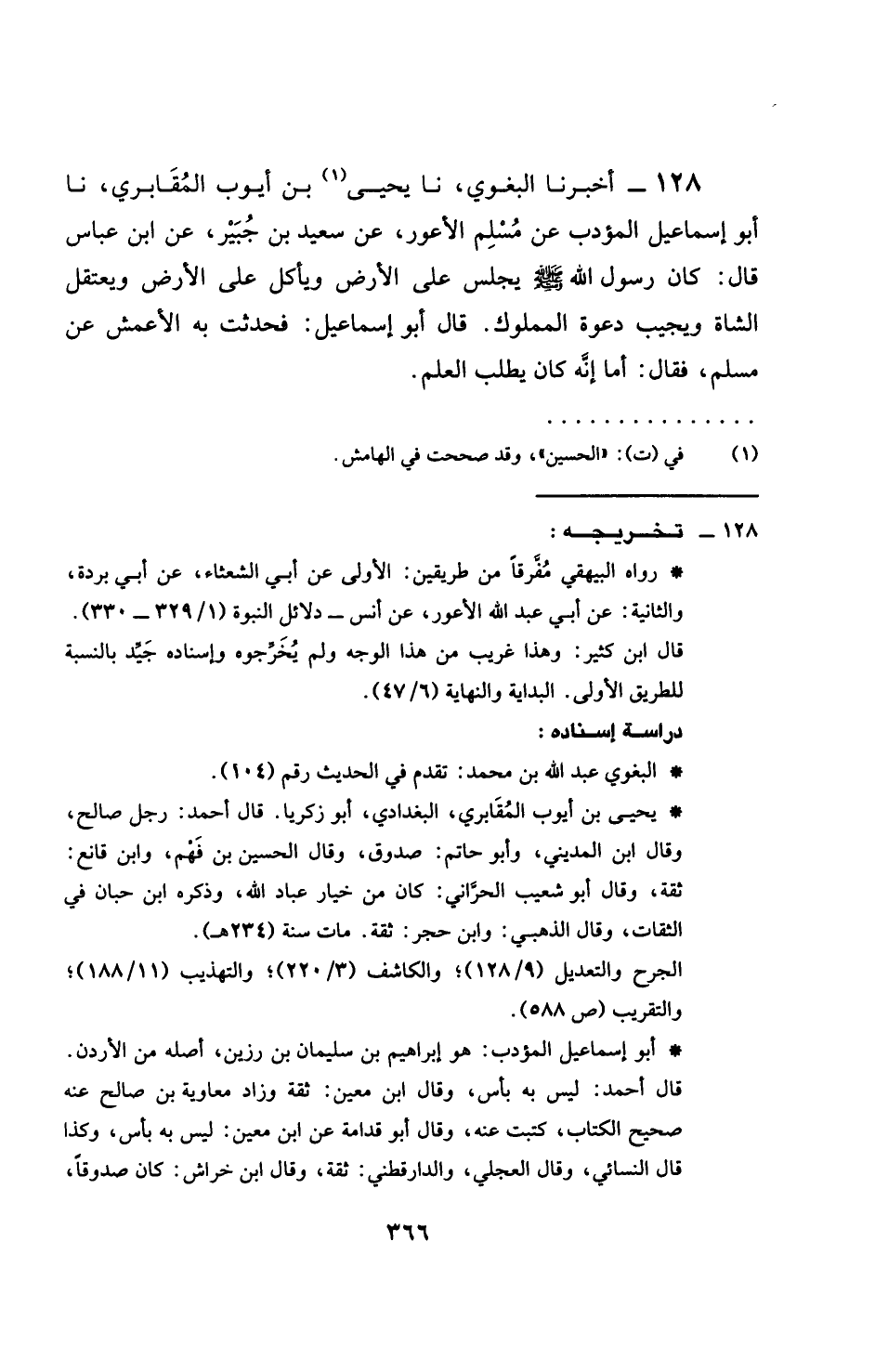 128 - أَخْبَرَنَا الْبَغَوِيُّ، نَا يَحْيَى بْنُ أَيُّوبَ الْمَقَابِرِيُّ، نَا أَبُو إِسْمَاعِيلَ الْمُؤَدِّبُ، عَنْ مُسْلِمٍ الْأَعْوَرِ، عَنْ سَعِيدِ بْنِ جُبَيْرٍ، عَنِ ابْنِ عَبَّاسٍ، قَالَ: «كَانَ رَسُولُ اللَّهِ صَلَّى اللهُ عَلَيْهِ وَسَلَّمَ §يَجْلِسُ عَلَى الْأَرْضِ، وَيَأْكُلُ عَلَى الْأَرْضِ، وَيَعْتَقِلُ الشَّاةَ، وَيُجِيبُ دَعْوَةَ الْمَمْلُوكِ» . قَالَ أَبُو إِسْمَاعِيلَ: فَحَدَّثْتُ بِهِ الْأَعْمَشَ عَنْ مُسْلِمٍ، فَقَالَ: أَمَا إِنَّهُ كَانَ يَطْلُبُ الْعِلْمَ