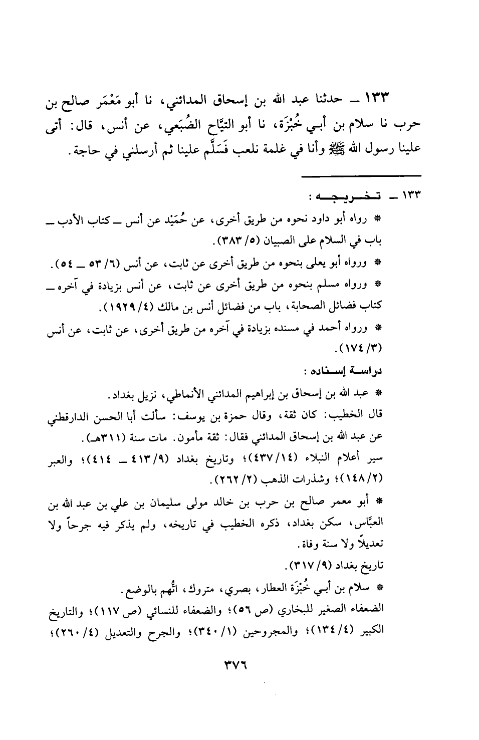 133 - حَدَّثَنَا عَبْدُ اللَّهِ بْنُ إِسْحَاقَ الْمَدَائِنِيُّ، نَا أَبُو مَعْمَرٍ صَالِحُ بْنُ حَرْبٍ، نَا سَلَّامُ ابْنُ أَبِي خُبْزَةَ، نَا أَبُو التَّيَّاحِ الضُّبَعِيُّ، عَنْ أَنَسٍ، قَالَ: §أَتَى عَلَيْنَا رَسُولُ اللَّهِ صَلَّى اللهُ عَلَيْهِ وَسَلَّمَ، وَأَنَا فِي غِلْمَةٍ نَلْعَبُ، فَسَلَّمَ عَلَيْنَا، ثُمَّ أَرْسَلَنِي فِي حَاجَةٍ
