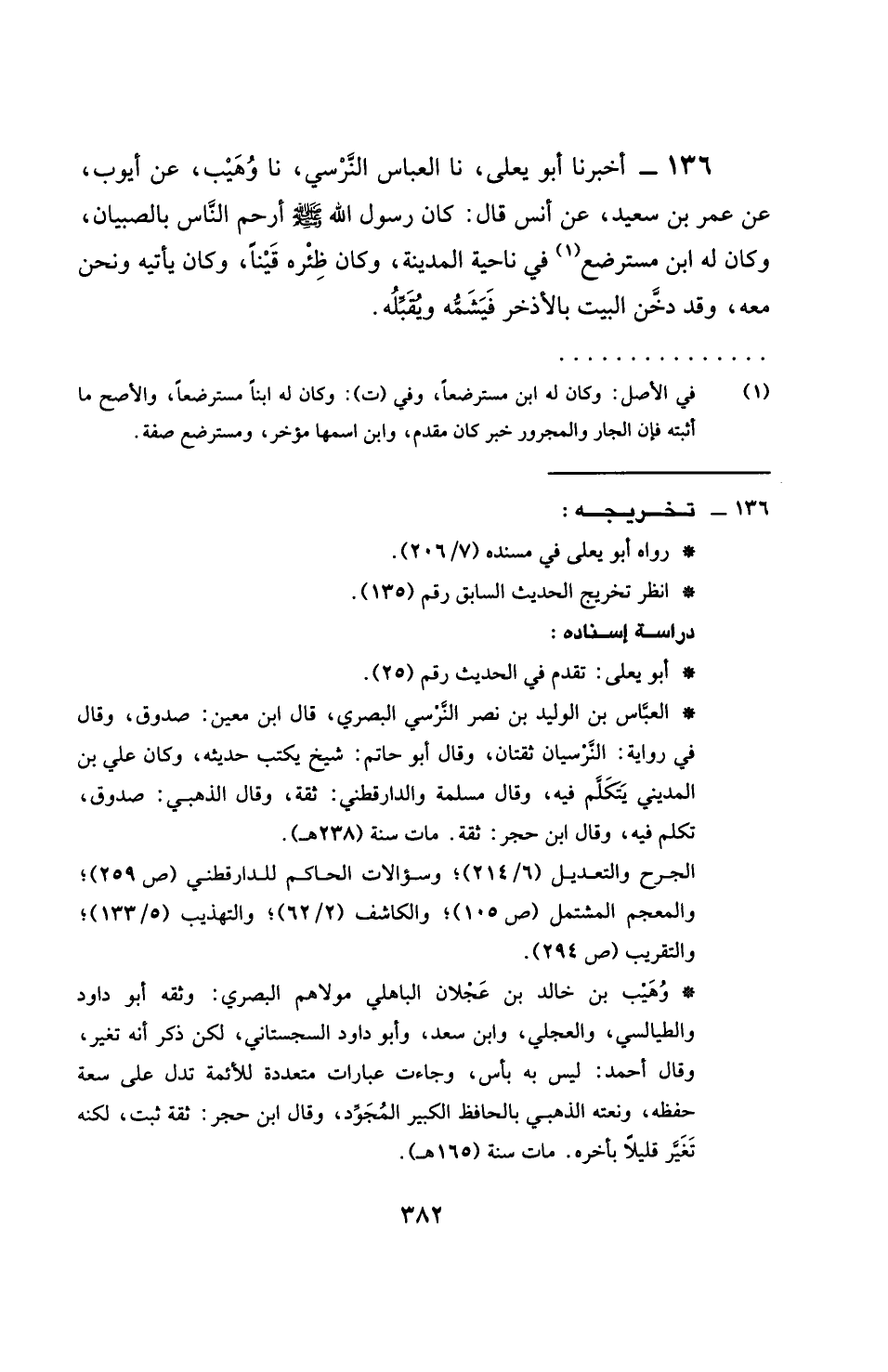 136 - أَخْبَرَنَا أَبُو يَعْلَى، نَا الْعَبَّاسُ النَّرْسِيُّ، نَا وُهَيْبٌ، عَنْ أَيُّوبَ، عَنْ عَمْرِو بْنِ سَعِيدٍ، عَنْ أَنَسٍ، قَالَ: كَانَ رَسُولُ اللَّهِ صَلَّى اللهُ عَلَيْهِ وَسَلَّمَ §أَرْحَمَ النَّاسِ بِالصِّبْيَانِ، وَكَانَ لَهُ ابْنٌ مُسْتَرْضَعٌ فِي نَاحِيَةِ الْمَدِينَةِ، وَكَانَ ظِئْرُهُ قَيْنًا، وَكَانَ يَأْتِيهِ وَنَحْنُ مَعَهُ، وَقَدْ دَخَنَ الْبَيْتَ بِالْإِذْخِرِ، فَيَشُمُّهُ وَيُقَبِّلُهُ