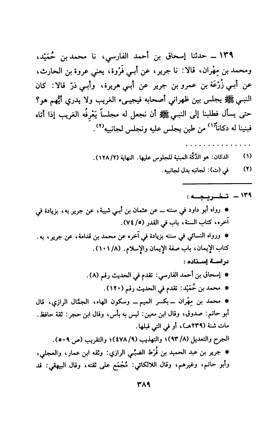139 - حَدَّثَنَا إِسْحَاقُ بْنُ أَحْمَدَ الْفَارِسِيُّ، نَا مُحَمَّدُ بْنُ حُمَيْدٌ، وَمُحَمَّدُ بْنُ مِهْرَانَ، قَالَا: نَا جَرِيرٌ، عَنْ أَبِي فَرْوَةَ يَعْنِي عُرْوَةَ بْنَ الْحَارِثِ، عَنْ أَبِي زُرْعَةَ بْنِ عَمْرِو بْنِ جَرِيرٍ، عَنْ أَبِي هُرَيْرَةَ، وَأَبِي ذَرٍّ، قَالَا: كَانَ النَّبِيُّ صَلَّى اللهُ عَلَيْهِ وَسَلَّمَ §يَجْلِسُ بَيْنَ ظَهْرَانَيْ أَصْحَابِهِ، فَيَجِيءُ الْغَرِيبُ وَلَا يَدْرِي أَيُّهُمْ هُوَ؟ حَتَّى يَسْأَلَ، فَطَلَبْنَا إِلَى النَّبِيِّ صَلَّى اللهُ عَلَيْهِ وَسَلَّمَ أَنْ نَجْعَلَ لَهُ مَجْلِسًا يَعْرِفُهُ الْغَرِيبُ إِذَا أَتَاهُ، فَبَنَيْنَا لَهُ دُكَّانًا مِنْ طِينٍ، فَكَانَ يَجْلِسُ عَلَيْهِ، وَنَجْلِسُ بِجَانِبَيْهِ