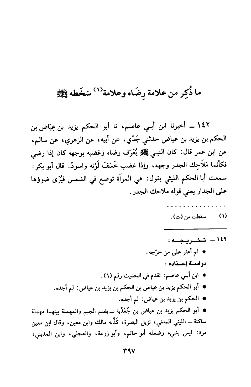 142 - أَخْبَرَنَا ابْنُ أَبِي عَاصِمٍ، نَا أَبُو الْحَكَمِ يَزِيدُ بْنُ عِيَاضِ بْنِ الْحَكَمِ بْنِ يَزِيدَ بْنِ عِيَاضٍ، حَدَّثَنِي جَدِّي، عَنْ أَبِيهِ، عَنِ الزُهْرِيِّ، عَنْ سَالِمٍ، عَنِ ابْنِ عُمَرَ، قَالَ: «كَانَ النَّبِيُّ صَلَّى اللهُ عَلَيْهِ وَسَلَّمَ §يُعْرَفُ رِضَاهُ وَغَضَبُهُ بِوَجْهِهِ، كَانَ إِذَا رَضِيَ فَكَأَنَّمَا مُلَاحِكَ الْجُدُرِ وَجْهُهُ، وَإِذَا غَضِبَ خُسِفَ لَوْنُهُ وَاسْوَدَّ» . قَالَ أَبُو بَكْرٍ: سَمِعْتُ أَبَا الْحَكَمِ اللَّيْثِيَّ يَقُولُ: هِيَ الْمِرْآةُ تُوضَعُ فِي الشَّمْسِ فَيُرَى ضَوْءُهَا عَلَى الْجِدَارِ، يَعْنِي قَوْلَهُ: مُلَاحِكَ الْجُدُرِ