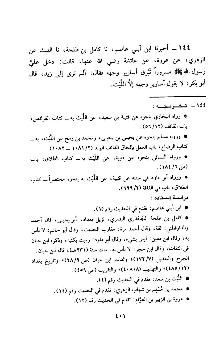 144 - أَخْبَرَنَا ابْنُ أَبِي عَاصِمٍ، نَا كَامِلُ بْنُ طَلْحَةَ، نَا اللَّيْثُ، عَنِ الزُهْرِيِّ، عَنْ عُرْوَةَ، عَنْ عَائِشَةَ، رَضِيَ اللَّهُ عَنْهَا قَالَتْ: §دَخَلَ عَلَيَّ رَسُولُ اللَّهِ صَلَّى اللهُ عَلَيْهِ وَسَلَّمَ مَسْرُورًا تَبْرُقُ أَسَارِيرُ وَجْهِهِ، فَقَالَ: أَلَمْ تَرَيْ إِلَى زَيْدٍ؟ . قَالَ أَبُو بَكْرٍ: لَا يَقُولُ أَسَارِيرَ وَجْهِهِ إِلَّا اللَّيْثُ