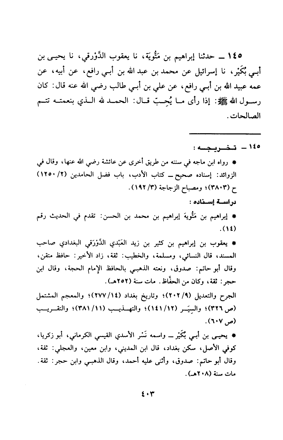 145 - حَدَّثَنَا إِبْرَاهِيمُ بْنُ مَتُّوَيْهِ، نَا يَعْقُوبُ الدَّوْرَقِيُّ، نَا يَحْيَى بْنُ أَبِي بُكَيْرٍ، نَا إِسْرَائِيلُ، عَنْ مُحَمَّدِ بْنِ عَبْدِ اللَّهِ بْنِ أَبِي رَافِعٍ، عَنْ أَبِيهِ، عَنْ عَمِّهِ عُبَيْدِ اللَّهِ بْنِ أَبِي رَافِعٍ، عَنْ عَلِيِّ بْنِ أَبِي طَالِبٍ، رَضِيَ اللَّهُ عَنْهُ قَالَ: " كَانَ رَسُولُ اللَّهِ صَلَّى اللهُ عَلَيْهِ وَسَلَّمَ §إِذَا رَأَى مَا يُحِبُّ، قَالَ: الْحَمْدُ لِلَّهِ الَّذِي بِنِعْمَتِهِ تَتِمُّ الصَّالِحَاتُ "