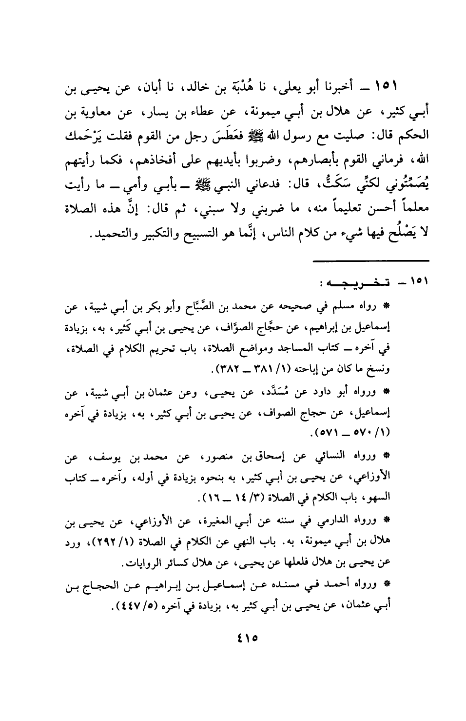151 - أَخْبَرَنَا أَبُو يَعْلَى، نَا هُدْبَةُ بْنُ خَالِدٍ، نَا أَبَانُ، عَنْ يَحْيَى بْنِ أَبِي كَثِيرٍ، عَنْ هِلَالِ بْنِ أَبِي مَيْمُونَةَ، عَنْ عَطَاءِ بْنِ يَسَارٍ، عَنْ مُعَاوِيَةَ بْنِ الْحَكَمِ، قَالَ: §صَلَّيْتُ مَعَ رَسُولُ اللَّهِ صَلَّى اللهُ عَلَيْهِ وَسَلَّمَ، فَعَطَسَ رَجُلٌ مِنَ الْقَوْمِ، فَقُلْتُ: يَرْحَمُكَ اللَّهُ فَرَمَانِي الْقَوْمُ بَأَبْصَارِهِمْ، وَضَرَبُوا بِأَيْدِيهِمْ عَلَى أَفْخَاذِهِمْ، فَلَمَّا رَأَيْتُهُمْ يُصْمِتُونِي، لَكِنِّي سَكَتُّ قَالَ: فَدَعَانِي النَّبِيُّ صَلَّى اللهُ عَلَيْهِ وَسَلَّمَ بِأَبِي وَأُمِّي مَا رَأَيْتُ مُعَلِّمًا أَحْسَنَ تَعْلِيمًا مِنْهُ، مَا ضَرَبَنِي وَلَا سَبَّنِي، ثُمَّ قَالَ: إِنَّ هَذِهِ الصَّلَاةَ لَا يَصْلُحُ فِيهَا شَيْءٌ مِنْ كَلَامِ النَّاسِ، إِنَّمَا هُوَ التَّسْبِيحُ وَالتَّكْبِيرُ وَالتَّحْمِيدُ