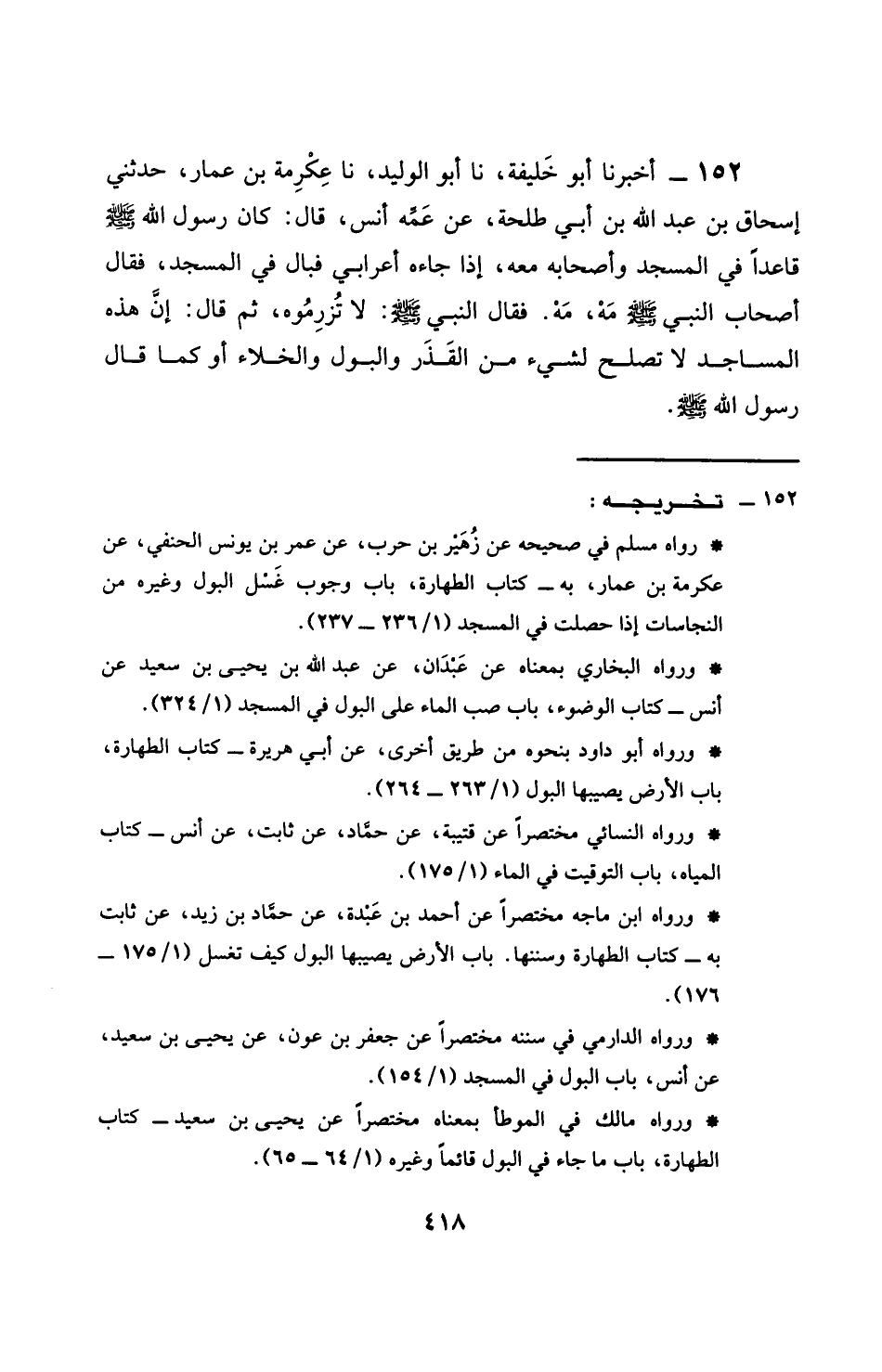 152 - أَخْبَرَنَا أَبُو خَلِيفَةَ، نَا أَبُو الْوَلِيدِ، نَا عِكْرِمَةُ بْنُ عَمَّارٍ، حَدَّثَنِي إِسْحَاقُ بْنُ عَبْدِ اللَّهِ بْنِ أَبِي طَلْحَةَ، عَنْ عَمِّهِ أَنَسٍ، قَالَ: §كَانَ رَسُولُ اللَّهِ صَلَّى اللهُ عَلَيْهِ وَسَلَّمَ قَاعِدًا فِي الْمَسْجِدِ وَأَصْحَابُهُ مَعَهُ، إِذْ جَاءَ أَعْرَابِيُّ، فَبَالَ فِي الْمَسْجِدِ، فَقَالَ أَصْحَابُ النَّبِيِّ صَلَّى اللهُ عَلَيْهِ وَسَلَّمَ: مَهْ، مَهْ، فَقَالَ النَّبِيُّ صَلَّى اللهُ عَلَيْهِ وَسَلَّمَ: لَا تُزْرِمُوهُ ثُمَّ قَالَ: إِنَّ هَذِهِ الْمَسَاجِدَ لَا تَصْلُحُ لِشَيْءٍ مِنَ الْقَذَرِ، وَالْبَوْلِ وَالْخَلَاءِ - أَوْ كَمَا قَالَ رَسُولُ اللَّهِ صَلَّى اللهُ عَلَيْهِ وَسَلَّمَ