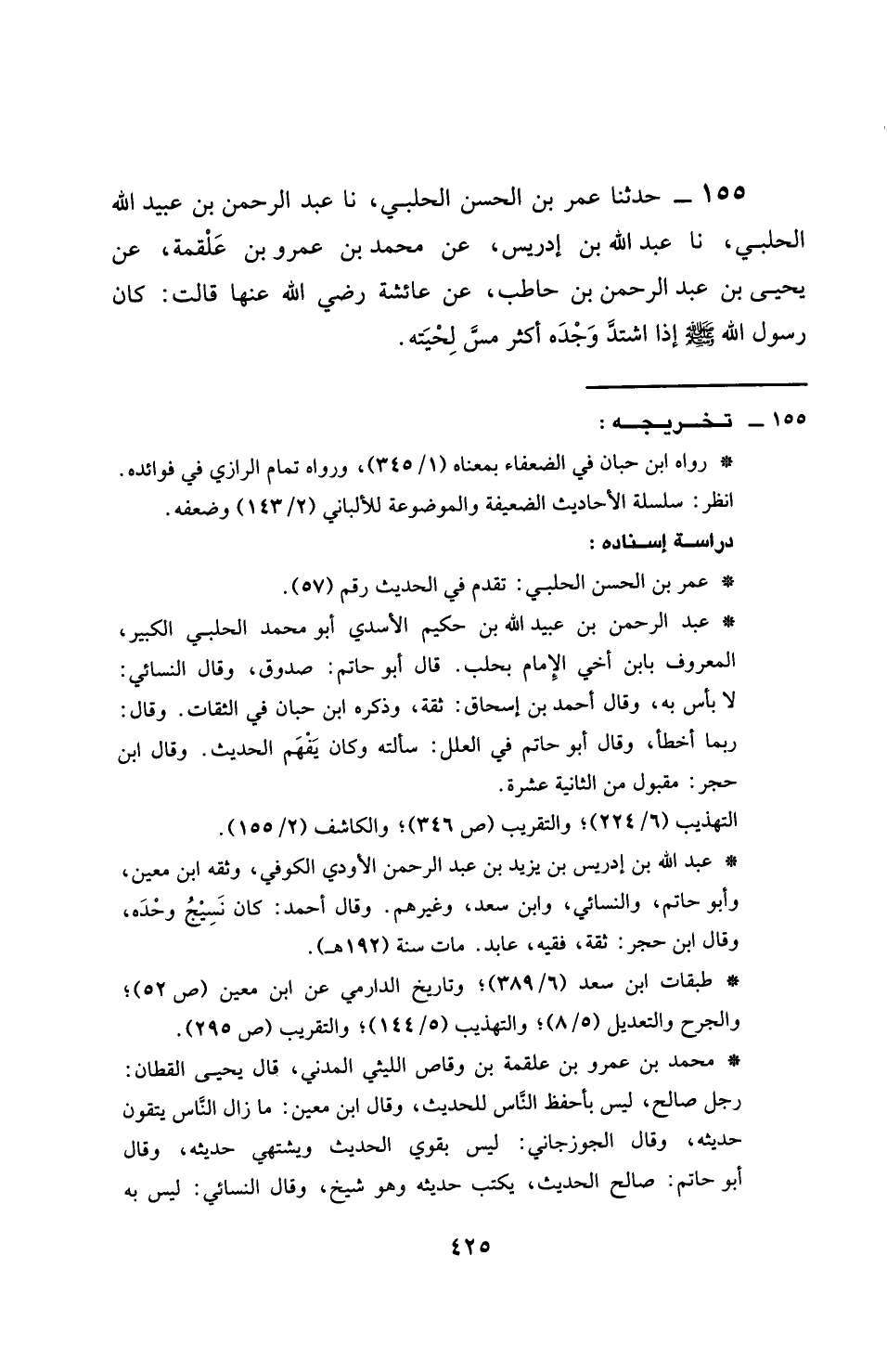155 - حَدَّثَنَا عُمَرُ بْنُ الْحَسَنِ الْحَلَبِيُّ، نَا عَبْدُ الرَّحْمَنِ بْنُ عُبَيْدِ اللَّهِ الْحَلَبِيُّ، نَا عَبْدُ اللَّهِ بْنُ إِدْرِيسَ، عَنْ مُحَمَّدِ بْنِ عَمْرِو بْنِ عَلْقَمَةَ، عَنْ يَحْيَى بْنِ عَبْدِ الرَّحْمَنِ بْنِ حَاطِبٍ، عَنْ عَائِشَةَ، رَضِيَ اللَّهُ عَنْهَا قَالَتْ: كَانَ رَسُولُ اللَّهِ صَلَّى اللهُ عَلَيْهِ وَسَلَّمَ §إِذَا اشْتَدَّ وَجْدُهُ أَكْثَرَ مَسَّ لِحْيَتِهِ