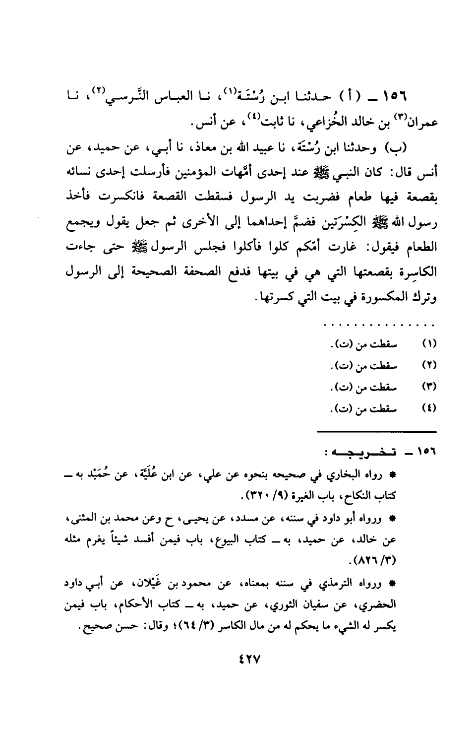 حَدَّثَنَا ابْنُ رُسْتَةَ، نَا الْعَبَّاسُ النَّرْسِيُّ، نَا عِمْرَانُ بْنُ خَالِدٍ الْخُزَاعِيُّ، نَا ثَابِتٌ، عَنْ أَنَسٍ. وَحَدَّثَنَا ابْنُ رُسْتَةَ، نَا عُبَيْدُ اللَّهِ بْنُ مُعَاذٍ، نَا أَبِي، عَنْ حُمَيْدٍ، عَنْ أَنَسٍ، قَالَ: §" كَانَ النَّبِيُّ صَلَّى اللهُ عَلَيْهِ وَسَلَّمَ عِنْدَ إِحْدَى أُمَّهَاتِ الْمُؤْمِنِينَ، فَأَرْسَلَتْ إِحْدَى نِسَائِهِ بِقَصْعَةٍ فِيهَا طَعَامٌ، فَضَرَبَتْ يَدَ الرَّسُولِ فَسَقَطَتِ الْقَصْعَةُ، فَانْكَسَرَتْ فَأَخَذَ رَسُولُ اللَّهِ صَلَّى اللهُ عَلَيْهِ وَسَلَّمَ الْكِسْرَتَيْنِ فَضَمَّ إِحْدَاهُمَا إِلَى الْأُخْرَى، ثُمَّ جَعَلَ يَقُولُ، وَيَجْمَعُ الطَّعَامَ فَيَقُولُ: غَارَتْ أُمُّكُمْ، كُلُوا. فَأَكَلُوا فَجَلَسَ الرَّسُولُ حَتَّى جَاءَتِ الْكَاسِرَةُ بِقَصْعَتِهَا الَّتِي هِيَ فِي بَيْتِهَا فَدَفَعَ الصَّحْفَةَ الصَّحِيحَةَ إِلَى الرَّسُولِ وَتَرَكَ الْمَكْسُورَةَ فِي بَيْتِ الَّتِي كَسَرَتْهَا "