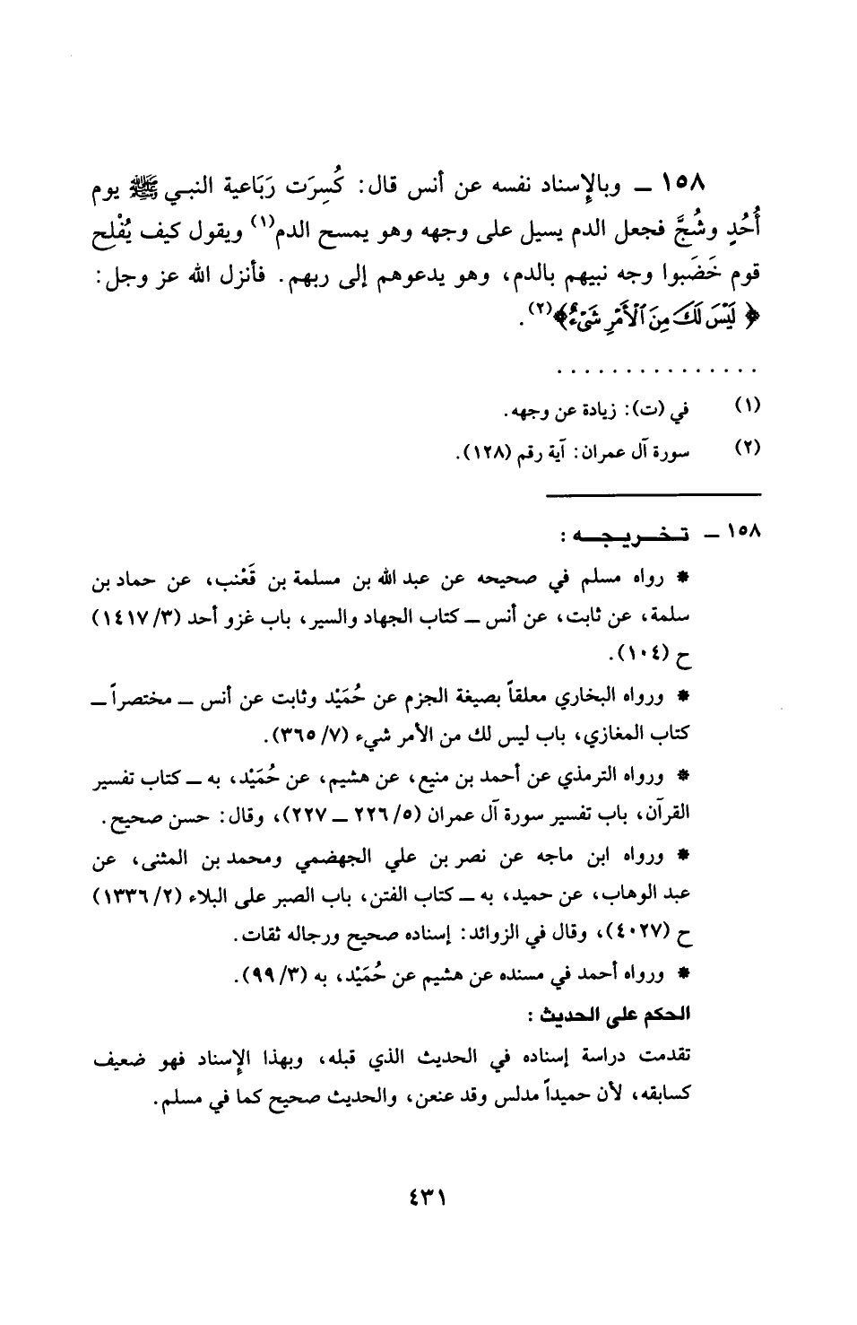158 - وَبِإِسْنَادِهِ عَنْ أَنَسٍ، قَالَ: §كُسِرَتْ رَبَاعِيَةُ النَّبِيِّ صَلَّى اللهُ عَلَيْهِ وَسَلَّمَ يَوْمَ أُحُدٍ وَشُجَّ فَجَعَلَ الدَّمُ يَسِيلُ عَلَى وَجْهِهِ، وَهُوَ يَمْسَحُ الدَّمَ، وَيَقُولُ: كَيْفَ يُفْلِحُ قَوْمٌ خَضَبُوا وَجْهَ نَبِيِّهِمْ بِالدَّمِ وَهُوَ يَدْعُوهُمْ إِلَى رَبِّهِمْ؟ فَأَنْزَلَ اللَّهُ عَزَّ وَجَلَّ: {لَيْسَ لَكَ مِنَ الْأَمْرِ شَيْءٌ} [آل عمران: 128]