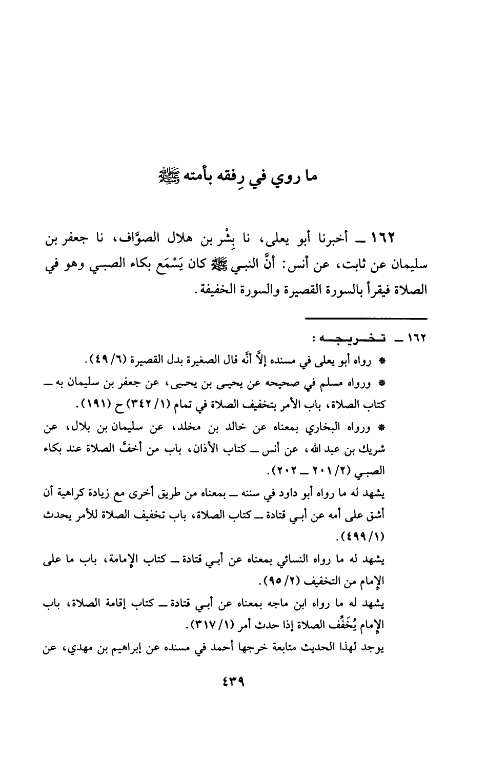 162 - أَخْبَرَنَا أَبُو يَعْلَى، نَا بِشْرُ بْنُ هِلَالٍ الصَّوَّافُ، نَا جَعْفَرُ بْنُ سُلَيْمَانَ، عَنْ ثَابِتٍ، عَنْ أَنَسٍ، «أَنَّ النَّبِيَّ صَلَّى اللهُ عَلَيْهِ وَسَلَّمَ كَانَ §يَسْمَعُ بُكَاءَ الصَّبِيِّ وَهُوَ فِي الصَّلَاةِ، فَيَقْرَأُ بِالسُّورَةِ الْقَصِيرَةِ، وَالسُّورَةِ الْخَفِيفَةِ»