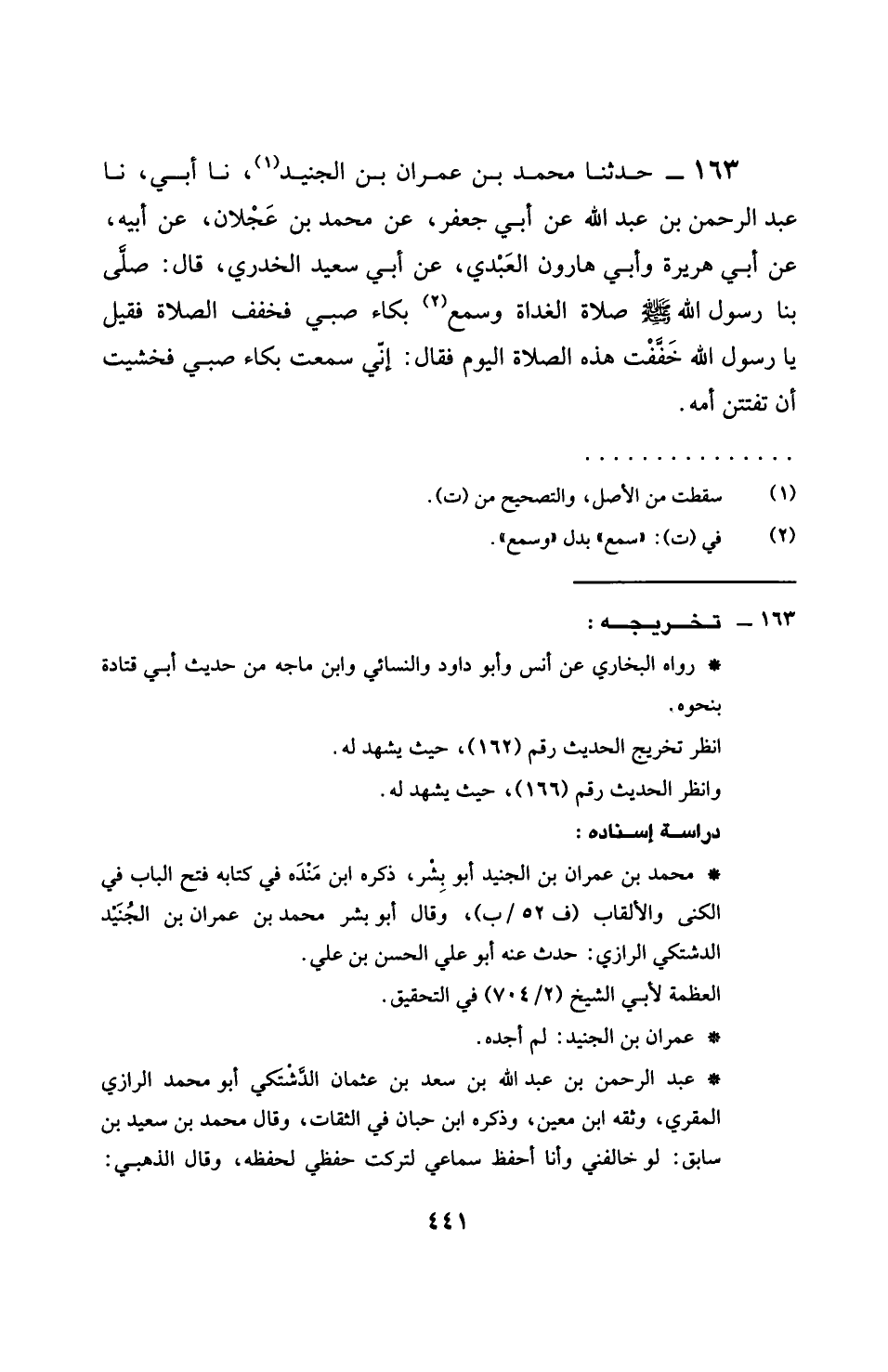 163 - حَدَّثَنَا مُحَمَّدُ بْنُ عِمْرَانَ بْنِ الْجُنَيْدِ، نَا أَبِي، نَا عَبْدُ الرَّحْمَنِ بْنُ عَبْدِ اللَّهِ، عَنْ أَبِي جَعْفَرٍ، عَنْ مُحَمَّدِ بْنِ عَجْلَانَ، عَنْ أَبِيهِ، عَنْ أَبِي هُرَيْرَةَ، وَأَبُو هَارُونَ الْعَبْدِيُّ، عَنْ أَبِي سَعِيدٍ الْخُدْرِيِّ، قَالَا: §صَلَّى بِنَا رَسُولُ اللَّهِ صَلَّى اللهُ عَلَيْهِ وَسَلَّمَ صَلَاةَ الْغَدَاةِ، وَسَمِعَ بُكَاءَ صَبِيٍّ فَخَفَّفَ الصَّلَاةَ فَقِيلَ: يَا رَسُولَ اللَّهِ، خَفَّفْتَ هَذِهِ الصَّلَاةَ الْيَوْمَ، فَقَالَ: إِنَّى سَمِعْتُ بُكَاءَ صَبِيٍّ، فَخَشِيتُ أَنْ يَفْتِنَ أُمَّهُ