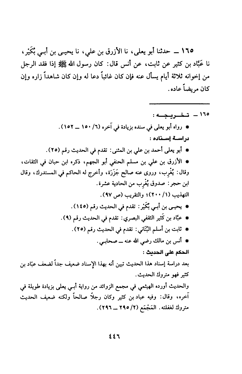 165 - حَدَّثَنَا أَبُو يَعْلَى، نَا الْأَزْرَقُ بْنُ عَلِيٍّ، نَا يَحْيَى بْنُ أَبِي بُكَيْرٍ، نَا عَبَّادُ بْنُ كَثِيرٍ، عَنْ ثَابِتٍ، عَنْ أَنَسٍ، قَالَ: «كَانَ رَسُولُ اللَّهِ صَلَّى اللهُ عَلَيْهِ وَسَلَّمَ §إِذَا فَقَدَ الرَّجُلَ مِنْ إِخْوَانِهِ ثَلَاثَةَ أَيَّامٍ، سَأَلَ عَنْهُ، فَإِنْ كَانَ غَائِبًا دَعَا لَهُ، وَإِنْ كَانَ شَاهِدًا زَارَهُ، وَإِنْ كَانَ مَرِيضًا عَادَهُ»