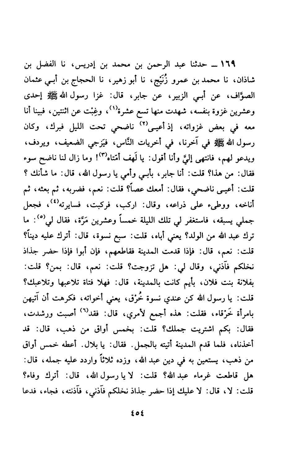 169 - حَدَّثَنَا عَبْدُ الرَّحْمَنِ بْنُ مُحَمَّدِ بْنِ إِدْرِيسَ، نَا الْفَضْلُ بْنُ شَاذَانَ، نَا مُحَمَّدُ بْنُ عَمْرٍو زُنَيْجٌ أَبُو زُهَيْرٍ، نَا الْحَجَّاجُ بْنُ أَبِي عُثْمَانَ الصَّوَّافُ، عَنْ أَبِي الزُّبَيْرِ، عَنْ جَابِرٍ، قَالَ: §غَزَا رَسُولُ اللَّهِ صَلَّى اللهُ عَلَيْهِ وَسَلَّمَ إِحْدَى وَعِشْرِينَ غَزْوَةً بِنَفْسِهِ، شَهِدْتُ تِسْعَ عَشْرَةَ، غِبْتُ عَنِ اثْنَتَيْنِ، فَبَيْنَا أَنَا مَعَهُ فِي بَعْضِ غَزَوَاتِهِ، إِذْ أَعْيَى نَاضِحِي تَحْتَ اللَّيْلِ فَبَرَكَ، وَكَانَ رَسُولُ اللَّهِ صَلَّى اللهُ عَلَيْهِ وَسَلَّمَ فِي آخِرِنَا، فِي أُخْرَيَاتِ النَّاسِ، فَيُزْجِي الضَّعِيفَ، وَيُرْدِفُ، وَيَدْعُو لَهُمْ، فَانْتَهَى إِلَيَّ وَأَنَا أَقُولُ: يَالَهْفَ أُمَّتَاهُ وَمَا زَالَ لَنَا نَاضِحُ سَوْءٍ فَقَالَ: مَنْ هَذَا؟ قُلْتُ: أَنَا جَابِرٌ، بِأَبِي وَأُمِّي يَا رَسُولَ اللَّهِ، قَالَ: مَا شَأْنُكَ؟ قُلْتُ: أَعْيَى نَاضِحِي، فَقَالَ: أَمَعَكَ عَصًا؟ قُلْتُ: نَعَمْ، فَضَرَبَهُ، ثُمَّ بَعَثَهُ، ثُمَّ أَنَاخَهُ، وَوَطِئَ عَلَى ذِرَاعِهِ، وَقَالَ: ارْكَبْ، فَرَكِبْتُ، فَسَايَرْتُهُ، فَجَعَلَ جَمَلِي يَسْبِقْهُ، فَاسْتَغْفَرَ لِي تِلْكَ اللَّيْلَةَ خَمْسًا وَعِشْرِينَ مَرَّةً، فَقَالَ لِي: مَا تَرَكَ عَبْدُ اللَّهِ مِنَ الْوَلَدِ؟ يَعْنِي أَبَاهُ، قُلْتُ سَبْعَ نِسْوَةٍ، قَالَ: أَتْرَكَ عَلَيْهِ دَيْنًا؟ قُلْتُ: نَعَمْ، قَالَ: فَإِذَا قَدِمْتَ الْمَدِينَةَ فَقَاطِعْهُمْ، فَإِنْ أَبَوْا فَإِذَا حَضَرَ جِدَادُ نَخْلِكُمْ فَآذِنِّي، وَقَالَ لِي: هَلْ تَزَوَّجْتَ؟ قُلْتُ: نَعَمْ، قَالَ: مِمَّنْ؟ قُلْتُ: بِفُلَانَةَ بِنْتِ فُلَانٍ، بِأَيِّمٍ كَانَتْ بِالْمَدِينَةِ، قَالَ: فَهَلَّا فَتَاةً تُلَاعِبُهَا وَتُلَاعِبُكَ؟ قُلْتُ: يَا رَسُولَ اللَّهِ كُنَّ عِنْدِي نِسْوَةٌ خُرْقٌ، يَعْنِي أَخَوَاتِهِ، فَكَرِهْتُ أَنْ آتِيَهُنَّ بِامْرَأَةٍ خَرْقَاءَ، فَقُلْتُ: هَذِهِ أَجْمَعُ لِأَمْرِي، قَالَ: فَقَدْ أَصَبْتَ وَرَشَدْتَ، فَقَالَ: بِكُمِ اشْتَرَيْتَ جَمَلَكَ؟ قُلْتُ: بِخَمْسِ أَوَاقٍ مِنْ ذَهَبٍ، قَالَ: قَدْ أَخَذْنَاهُ، فَلَمَّا قَدِمَ الْمَدِينَةَ أَتَيْتُهُ بِالْجَمَلِ فَقَالَ يَا بِلَالُ أَعْطِهِ خَمْسَ أَوْرَاقٍ مِنْ ذَهَبٍ، يَسْتَعِينُ بِهَا فِي دَيْنِ عَبْدِ اللَّهِ، وَزِدْهُ ثَلَاثًا وَارْدُدْ عَلَيْهِ جَمَلَهُ، قَالَ: هَلْ قَاطَعْتَ غُرَمَاءَ عَبْدِ اللَّهِ؟ قُلْتُ: لَا يَا رَسُولَ اللَّهِ، قَالَ: أَتَرَكَ وَفَاءً؟ قُلْتُ: لَا، قَالَ: لَا عَلَيْكَ، إِذَا حَضَرَ جِدَادُ نَخْلِكُمْ فَآذِنِّي، فَآذَنْتُهُ، فَجَاءَ -[455]- فَدَعَا لَنَا فَاسْتَوْفَى كُلُّ غَرِيمٍ مَا كَانَ يَطْلُبُ تَمْرًا، وَفَاءً وَبَقِيَ لَنَا مَا كُنَّا نَجِدُ وَأَكْثَرُ، فَقَالَ رَسُولُ اللَّهِ صَلَّى اللهُ عَلَيْهِ وَسَلَّمَ: ارْفَعُوا وَلَا تَكِيلُوا، فَرَفَعْنَا، فَأَكَلْنَا مِنْهُ زَمَانًا