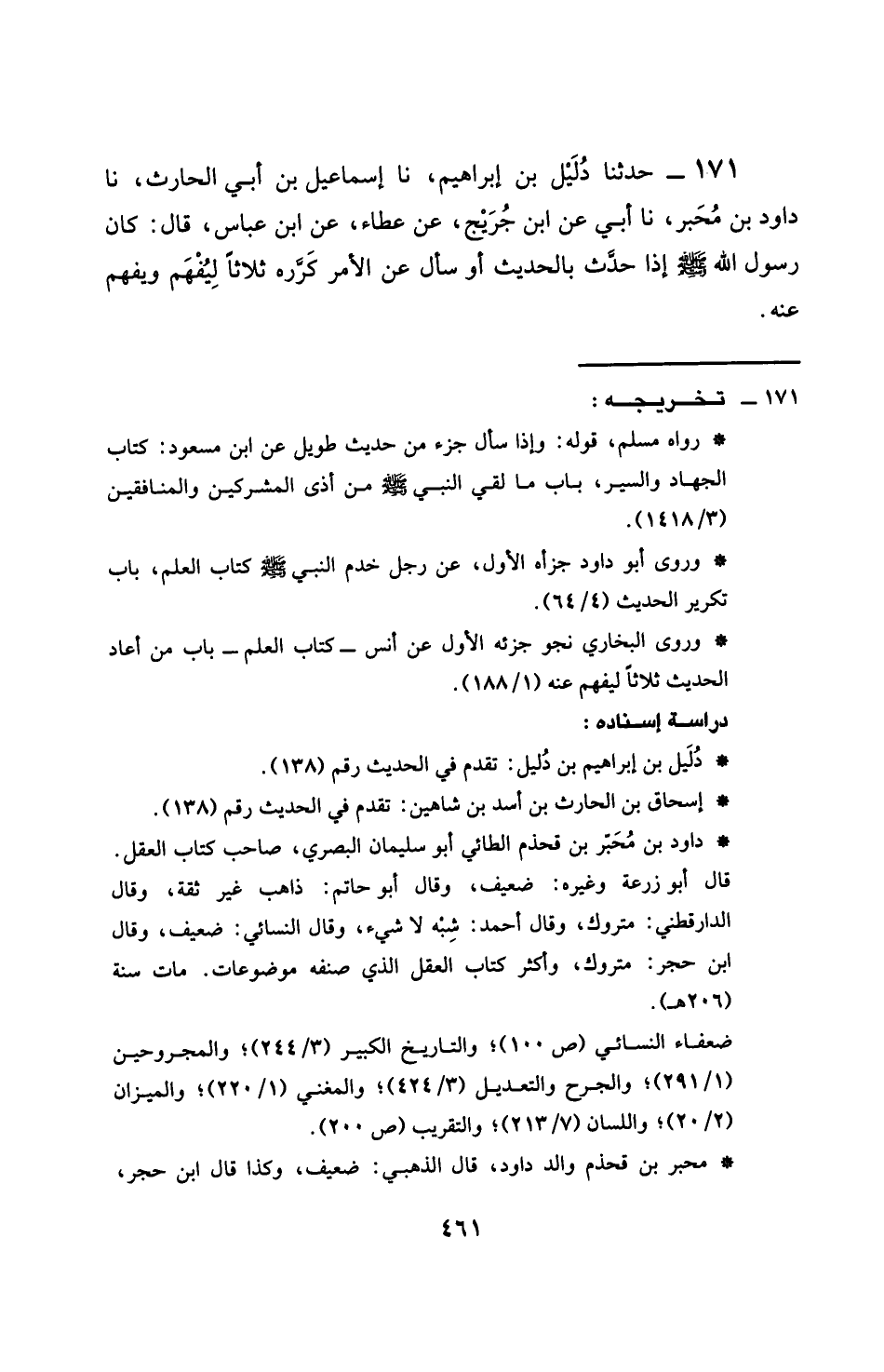 171 - حَدَّثَنَا دَلِيلُ بْنُ إِبْرَاهِيمَ، نَا إِسْمَاعِيلُ بْنُ الْحَارِثِ، نَا دَاودُ بْنُ مُحَبِّرٍ، نَا أَبِي، عَنِ ابْنِ جُرَيْجٍ، عَنْ عَطَاءٍ، عَنِ ابْنِ عَبَّاسٍ، قَالَ: «كَانَ رَسُولُ اللَّهِ صَلَّى اللهُ عَلَيْهِ وَسَلَّمَ §إِذَا حَدَّثَ بِالْحَدِيثِ، أَوْ سَأَلَ عَنِ الْأَمْرِ، كَرَّرَهُ ثَلَاثًا، لِيُفْهِمَ وَيُفْهَمَ عَنْهُ»