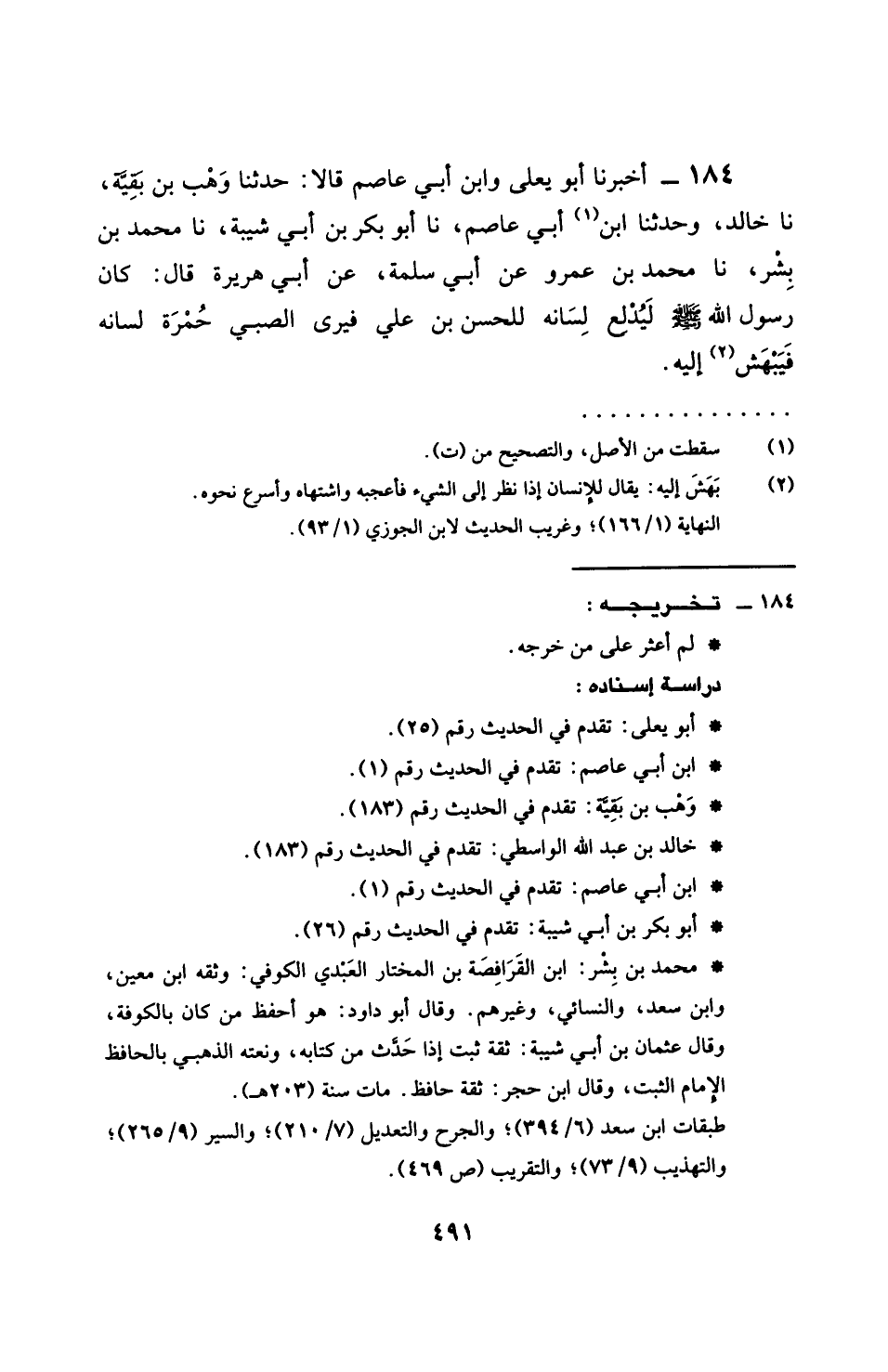 184 - أَخْبَرَنَا أَبُو يَعْلَى، وَابْنُ أَبِي عَاصِمٍ، قَالَا: حَدَّثَنَا وَهْبُ بْنُ بَقِيَّةَ، نَا خَالِدٌ، قَالَ: نَا أَبُو بَكْرِ ابْنُ أَبِي شَيْبَةَ، نَا مُحَمَّدُ بْنُ بِشْرٍ، نَا مُحَمَّدُ بْنُ عَمْرٍو، عَنْ أَبِي سَلَمَةَ، عَنْ أَبِي هُرَيْرَةَ، قَالَ: كَانَ رَسُولُ اللَّهِ صَلَّى اللهُ عَلَيْهِ وَسَلَّمَ §لَيُدْلِعُ لِسَانَهُ لِلْحَسَنِ بْنِ عَلِيٍّ، فَيَرَى الصَّبِيُّ حُمْرَةَ لِسَانِهِ فَيَبْهَشُ إِلَيْهِ