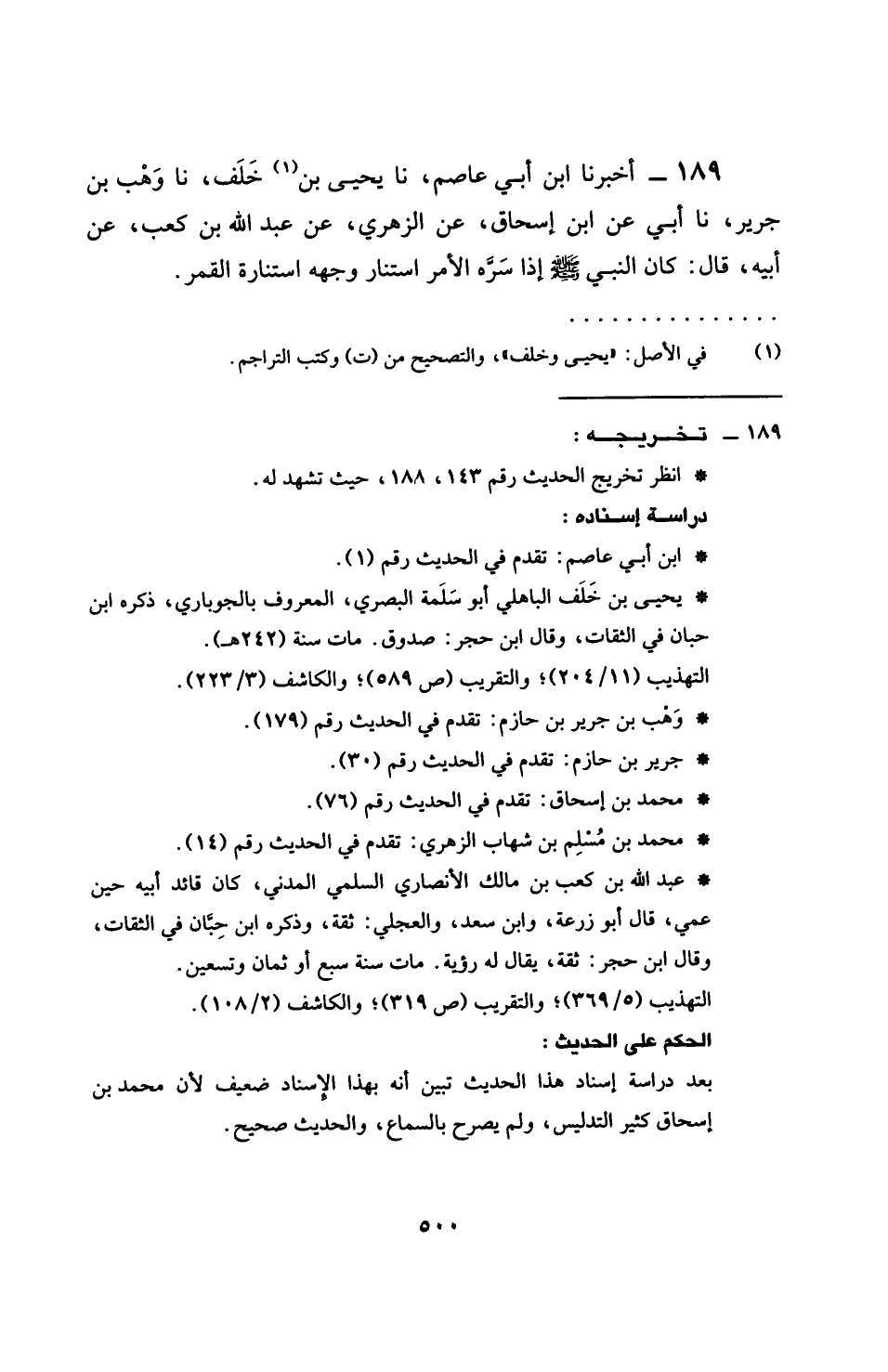 189 - أَخْبَرَنَا ابْنُ أَبِي عَاصِمٍ، نَا يَحْيَى، وَخَلَفٌ، نَا وَهْبُ بْنُ جَرِيرٍ، نَا أَبِي، عَنِ ابْنِ إِسْحَاقَ، عَنِ الزُّهْرِيِّ، عَنْ عَبْدِ اللَّهِ بْنِ كَعْبٍ، عَنْ أَبِيهِ، قَالَ: كَانَ النَّبِيُّ صَلَّى اللهُ عَلَيْهِ وَسَلَّمَ §إِذَا سَرَّهُ الْأَمْرُ اسْتَنَارَ وَجْهُهُ اسْتِنَارَةَ الْقَمَرِ