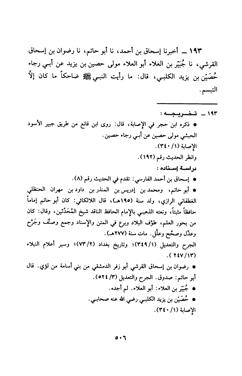 193 - أَخْبَرَنَا إِسْحَاقُ بْنُ أَحْمَدَ، نَا أَبُو حَاتِمٍ، نَا رِضْوَانُ بْنُ إِسْحَاقَ الْقُرَشِيُّ، نَا جُبَيْرُ بْنُ الْعَلَاءِ أَبُو الْعَلَاءِ، مَوْلَى حُصَيْنِ بْنِ يَزِيدَ، عَنْ أَبِي رَجَاءٍ حُصَيْنِ بْنِ يَزِيدَ الْكَلْبِيِّ، قَالَ: §مَا رَأَيْتُ النَّبِيَّ صَلَّى اللهُ عَلَيْهِ وَسَلَّمَ ضَاحِكًا، مَا كَانَ إِلَّا التَّبَسُّمِ