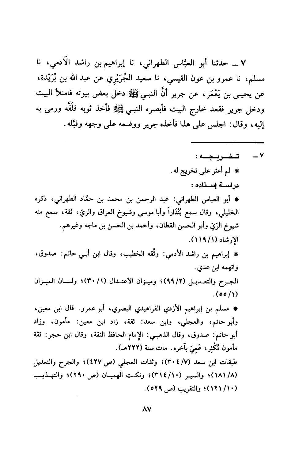 7 - حَدَّثَنَا أَبُو الْعَبَّاسِ الطِّهْرَانِيُّ، نَا إِبْرَاهِيمُ بْنُ رَاشِدٍ الْآدَمَيُّ، نَا مُسْلِمٌ، نَا عَمْرُو بْنُ عَوْنٍ الْقَيْسِيُّ، نَا سَعِيدٌ الْجَرِيرِيُّ، عَنْ عَبْدِ اللَّهِ بْنِ بُرَيْدَةَ، عَنْ يَحْيَى بْنِ يَعْمُرَ، عَنْ جَرِيرٍ، " أَنَّ النَّبِيَّ صَلَّى اللهُ عَلَيْهِ وَسَلَّمَ §دَخَلَ بَعْضَ بُيُوتِهِ، فَامْتَلَأَ الْبَيْتُ، وَدَخَلَ جَرِيرٌ فَقَعَدَ خَارِجَ الْبَيْتِ، فَأَبْصَرَهُ النَّبِيُّ صَلَّى اللهُ عَلَيْهِ وَسَلَّمَ، فَأَخَذَ ثَوْبَهُ فَلَفَّهُ وَرَمَى بِهِ إِلَيْهِ، وَقَالَ: اجْلِسْ عَلَى هَذَا، فَأَخَذَهُ جَرِيرٌ، وَوَضَعَهُ عَلَى وَجْهِهِ، وَقَبَّلَهُ "