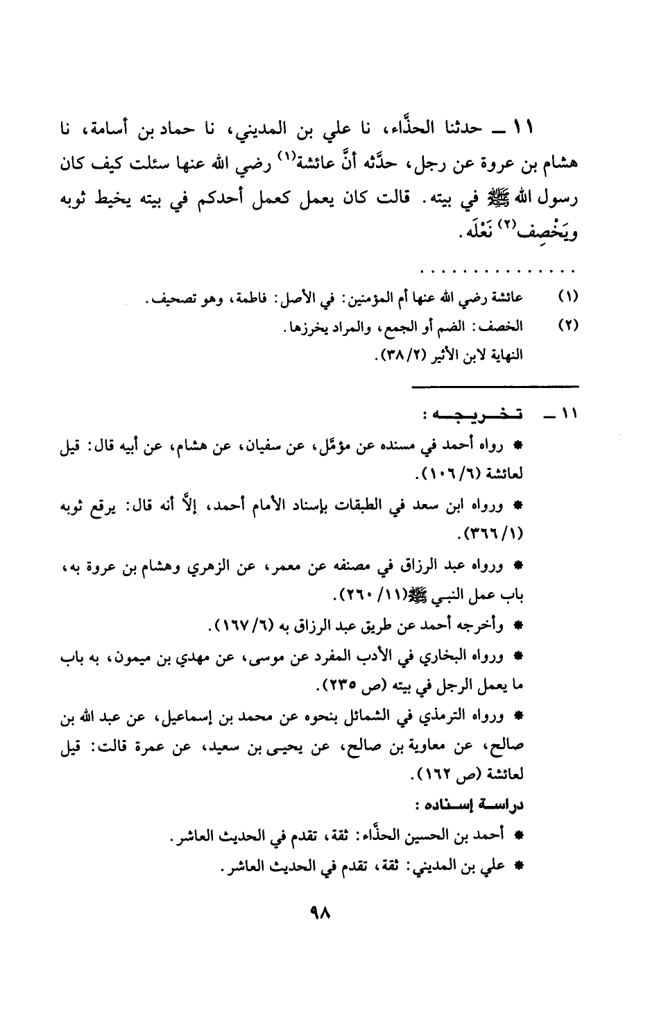 11 - حَدَّثَنَا الْحَذَّاءُ، نَا عَلِيُّ بْنُ الْمَدِينِيِّ، نَا حَمَّادُ بْنُ أُسَامَةَ، نَا هِشَامُ بْنُ عُرْوَةَ، عَنْ رَجُلٍ حَدَّثَهُ، أَنَّ عَائِشَةَ رَضِيَ اللَّهُ عَنْهَا سُئِلَتْ: §كَيْفَ كَانَ رَسُولُ اللَّهِ صَلَّى اللهُ عَلَيْهِ وَسَلَّمَ فِي بَيْتِهِ؟ قَالَتْ: كَانَ يَعْمَلُ كَعَمَلِ أَحَدِكُمْ فِي بَيْتِهِ يَخِيطُ ثَوْبَهُ، وَيَخْصِفُ نَعْلَهُ