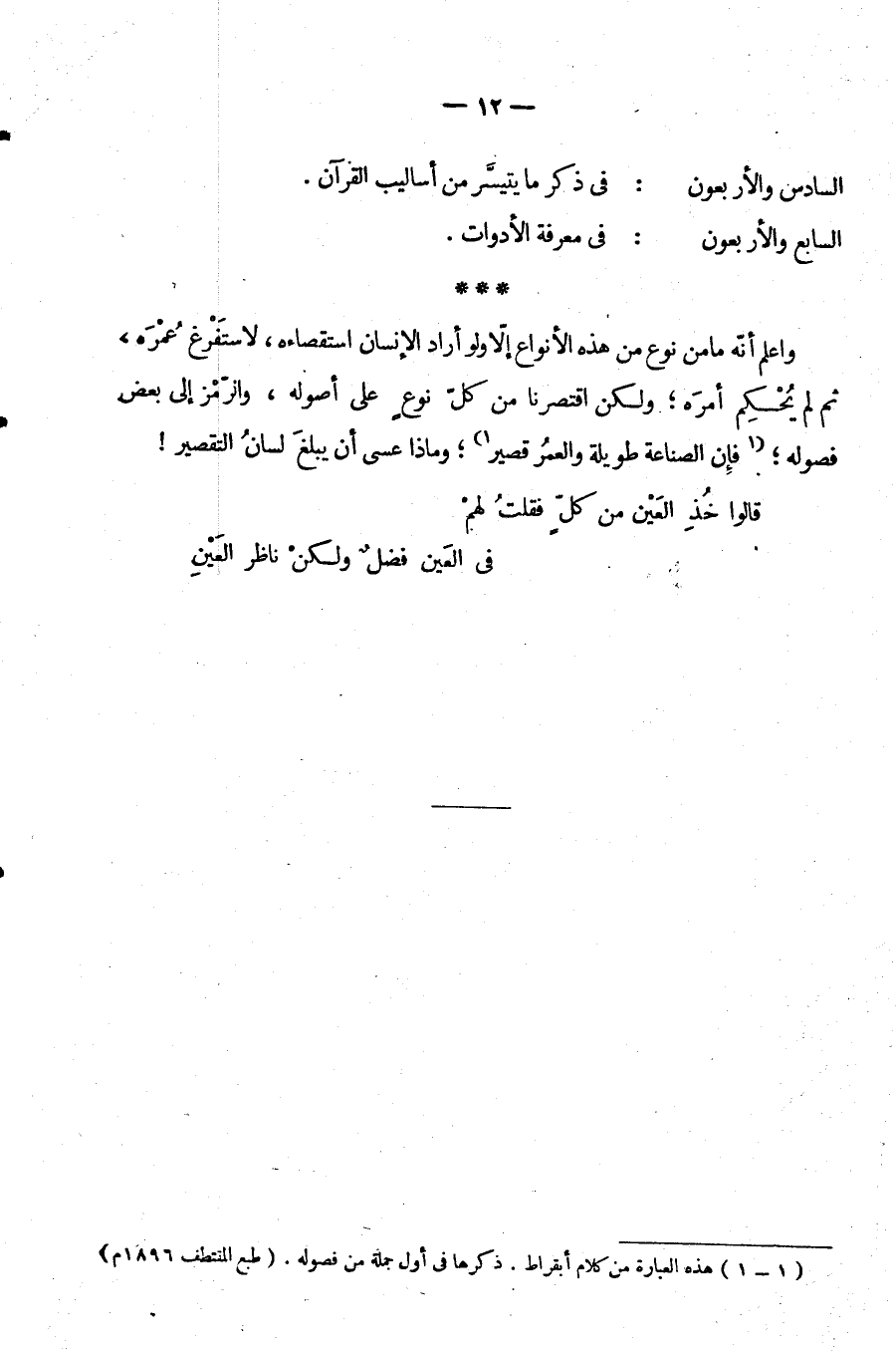 وَاعْلَمْ أَنَّهُ مَا مِنْ نَوْعٍ مِنْ هَذِهِ الْأَنْوَاعِ إِلَّا وَلَوْ أَرَادَ الْإِنْسَانُ اسْتِقْصَاءَهُ لَاسْتَفْرَغَ عُمُرَهُ ثُمَّ لَمْ يُحْكِمْ أَمْرَهُ وَلَكِنِ اقْتَصَرْنَا مِنْ كُلِّ نَوْعٍ عَلَى أُصُولِهِ وَالرَّمْزِ إِلَى بَعْضِ فُصُولِهِ فَإِنَّ الصِّنَاعَةَ طَوِيلَةٌ وَالْعُمُرَ قَصِيرٌ ماذا عسى أن يبلغ لسان لتقصير