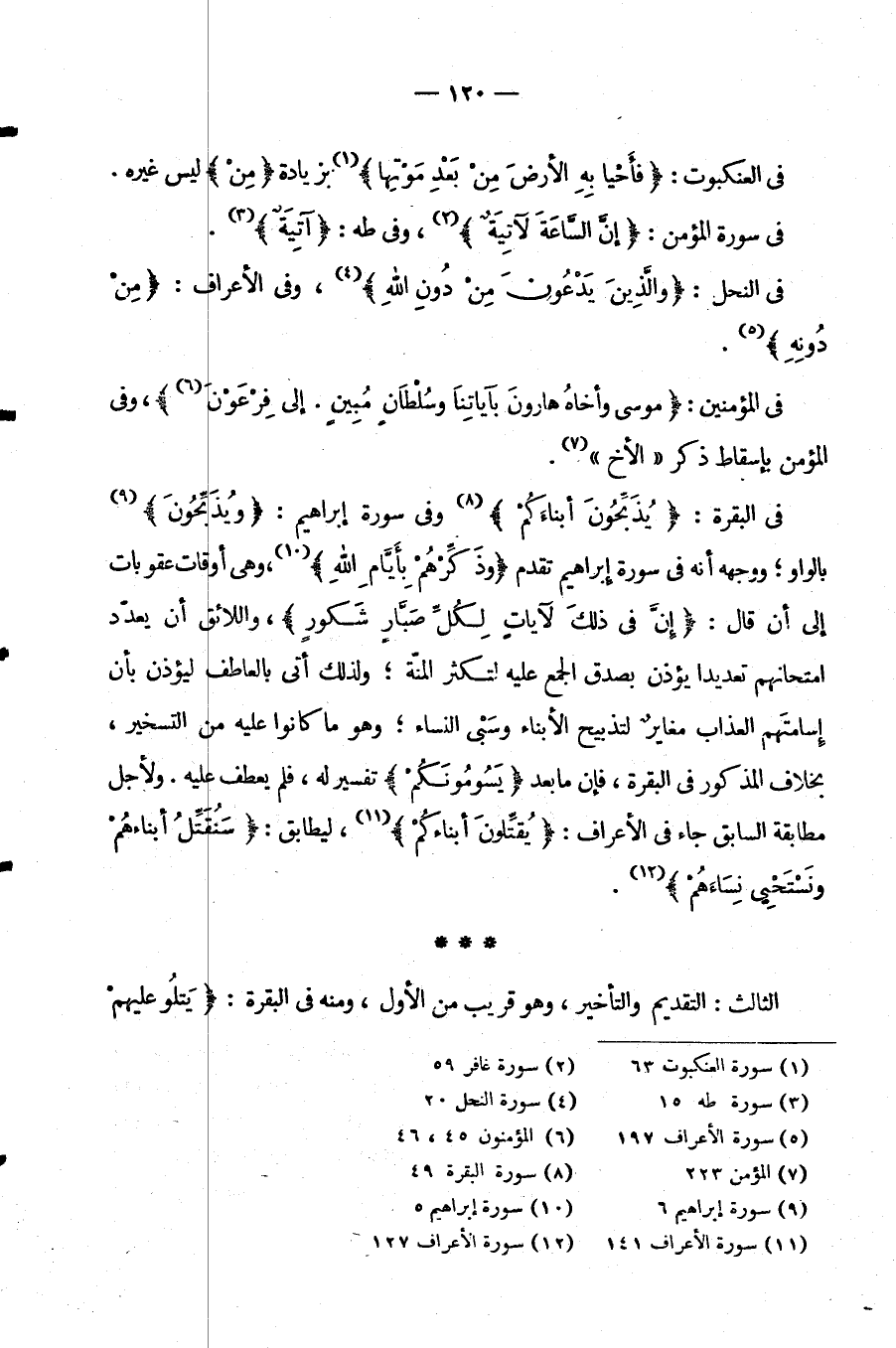 فِي الْعَنْكَبُوتِ: {فَأَحْيَا بِهِ الْأَرْضَ مِنْ بَعْدِ موتها} بِزِيَادَةِ {مِنْ} لَيْسَ غَيْرَهُ فِي سُورَةِ الْمُؤْمِنِ: {إن الساعة لآتية} وفي طه: {آتية} فِي النَّحْلِ: {وَالَّذِينَ يَدْعُونَ مِنْ دُونِ اللَّهِ} وفي الأعراف {من دونه} فِي الْمُؤْمِنِينَ: {مُوسَى وَأَخَاهُ هَارُونَ بِآيَاتِنَا وَسُلْطَانٍ مبين} وفي المؤمن بإسقاط ذكر الأخ في البقرة: {يذبحون أبناءكم} وفي سورة إبراهيم: {ويذبحون} بِالْوَاوِ وَوَجْهُهُ أَنَّهُ فِي سُورَةِ إِبْرَاهِيمَ تَقَدَّمَ: {وذكرهم بأيام الله} وَهِيَ أَوْقَاتُ عُقُوبَاتٍ إِلَى أَنْ قَالَ: {إِنَّ فِي ذَلِكَ لَآيَاتٍ لِكُلِّ صَبَّارٍ شَكُورٍ} وَاللَّائِقُ أَنْ يُعَدِّدَ امْتِحَانَهُمْ تَعْدِيدًا يُؤْذِنُ بِصِدْقِ الْجَمْعِ عَلَيْهِ لِتَكْثِيرِ الْمِنَّةِ وَلِذَلِكَ أَتَى بِالْعَاطِفِ لِيُؤْذِنَ بِأَنْ إِسَامَتَهُمُ الْعَذَابَ مُغَايِرٌ لِتَذْبِيحِ الْأَبْنَاءِ وَسَبْيِ النِّسَاءِ وَهُوَ مَا كَانُوا عَلَيْهِ مِنَ التَّسْخِيرِ بِخِلَافِ الْمَذْكُورِ فِي الْبَقَرَةِ فَإِنَّ مَا بَعْدَ: {يَسُومُونَكُمْ} تَفْسِيرٌ لَهُ فَلَمْ يَعْطِفْ عَلَيْهِ وَلِأَجْلِ مُطَابَقَةِ السَّابِقِ جَاءَ فِي الْأَعْرَافِ: {يُقَتِّلُونَ أَبْنَاءَكُمْ} ليطابق: {سنقتل أبناءهم ونستحيي نساءهم}