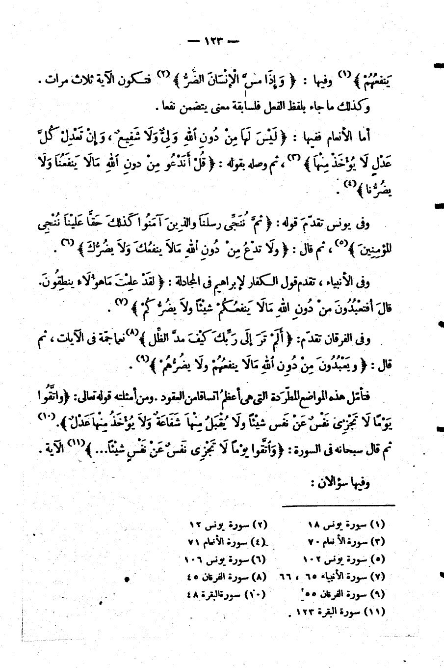 فَتَأَمَّلْ هَذِهِ الْمَوَاضِعَ الْمُطَّرِدَةَ الَّتِي هِيَ أَعْظَمُ اتِّسَاقًا مِنَ الْعُقُودِ وَمِنْ أَمْثِلَتِهِ قَوْلُهُ تَعَالَى: {وَاتَّقُوا يَوْمًا لَا تَجْزِي نَفْسٌ عَنْ نَفْسٍ شَيْئًا وَلَا يُقْبَلُ مِنْهَا شَفَاعَةٌ وَلَا يُؤْخَذُ مِنْهَا عدل} ثم قال سبحانه فِي السُّورَةِ: {وَاتَّقُوا يَوْمًا لَا تَجْزِي نَفْسٌ عَنْ نَفْسٍ شيئا} الآيةوفيها سؤالان: