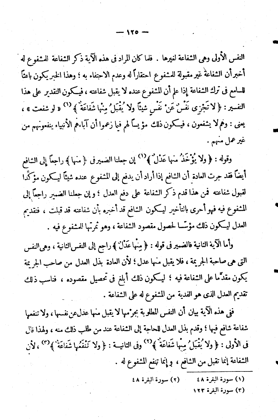 وَأَمَّا الْآيَةَ الثَّانِيَةُ: فَالضَّمِيرُ فِي قَوْلِهِ {مِنْهَا عَدْلٌ} رَاجِعٌ إِلَى النَّفْسِ الثَّانِيَةِ وَهِيَ النَّفْسُ الَّتِي هِيَ صَاحِبَةُ الْجَرِيمَةِ فَلَا يُقْبَلُ منها عدل لأن العادة بَذْلَ الْعَدْلِ مِنْ صَاحِبِ الْجَرِيمَةِ يَكُونُ مُقَدَّمًا عَلَى الشَّفَاعَةِ فِيهِ لِيَكُونَ ذَلِكَ أَبْلَغَ فِي تَحْصِيلِ مَقْصُودِهِ فَنَاسَبَ ذَلِكَ تَقْدِيمَ الْعَدْلِ الَّذِي هُوَ الْفِدْيَةُ مِنَ الْمَشْفُوعِ لَهُ عَلَى الشَّفَاعَةِ
