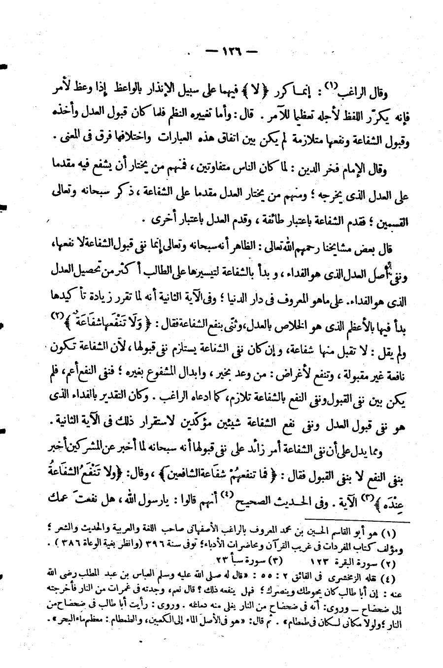 وَقَالَ الْإِمَامُ فَخْرُ الدِّينِ لَمَّا كَانَ النَّاسُ مُتَفَاوِتِينَ فَمِنْهُمْ مَنْ يَخْتَارُ أَنْ يُشْفَعَ فِيهِ مُقَدَّمًا عَلَى الْعَدْلِ الَّذِي يُخْرِجُهُ وَمِنْهُمْ مَنْ يَخْتَارُ الْعَدْلَ مُقَدَّمًا عَلَى الشَّفَاعَةِ ذَكَرَ سُبْحَانَهُ وَتَعَالَى الْقِسْمَيْنِ فَقَدَّمَ الشَّفَاعَةَ بِاعْتِبَارِ طَائِفَةٍ وَقَدَّمَ الْعَدْلَ بِاعْتِبَارِ أُخْرَى