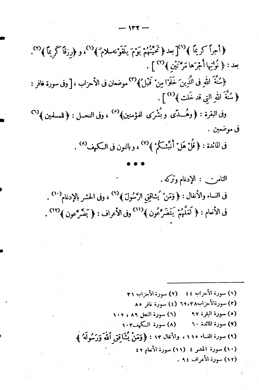 {سُنَّةَ اللَّهِ فِي الَّذِينَ خَلَوْا مِنْ قَبْلُ} موضعان في الأحزاب وَفِي سُورَةِ غَافِرٍ: {سُنَّةَ اللَّهِ الَّتِي قَدْ خلت} وفي البقرة: {وهدى وبشرى للمؤمنين} وفي النحل: {للمسلمين} ، في موضعين