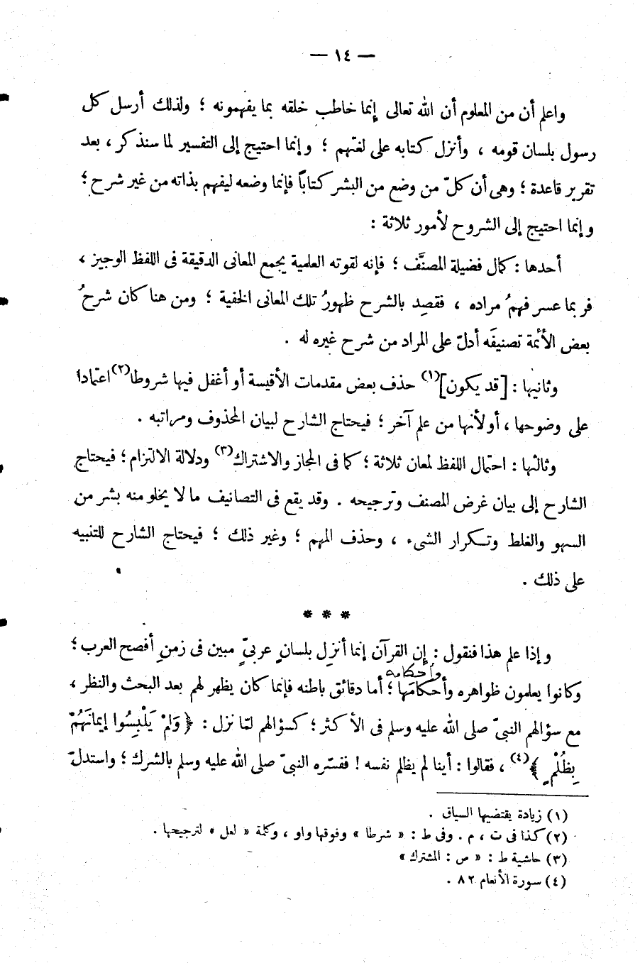 وَاعْلَمْ أَنَّ مِنَ الْمَعْلُومِ أَنَّ اللَّهَ تَعَالَى إِنَّمَا خَاطَبَ خَلْقَهُ بِمَا يَفْهَمُونَهُ وَلِذَلِكَ أَرْسَلَ كُلَّ رَسُولٍ بِلِسَانِ قَوْمِهِ وَأَنْزَلَ كِتَابَهُ عَلَى لُغَتِهِمْ وَإِنَّمَا احْتِيجَ إِلَى التَّفْسِيرِ لِمَا سَنَذْكُرُ بَعْدَ تَقْرِيرِ قَاعِدَةٍ وَهِيَ أَنَّ كُلَّ مَنْ وَضَعَ مِنَ الْبَشَرِ كِتَابًا فَإِنَّمَا وَضَعَهُ لِيُفْهَمَ بِذَاتِهِ مِنْ غَيْرِ شَرْحٍ وَإِنَّمَا احْتِيجَ إِلَى الشُّرُوحِ لِأُمُورٍ ثَلَاثَةٍ: