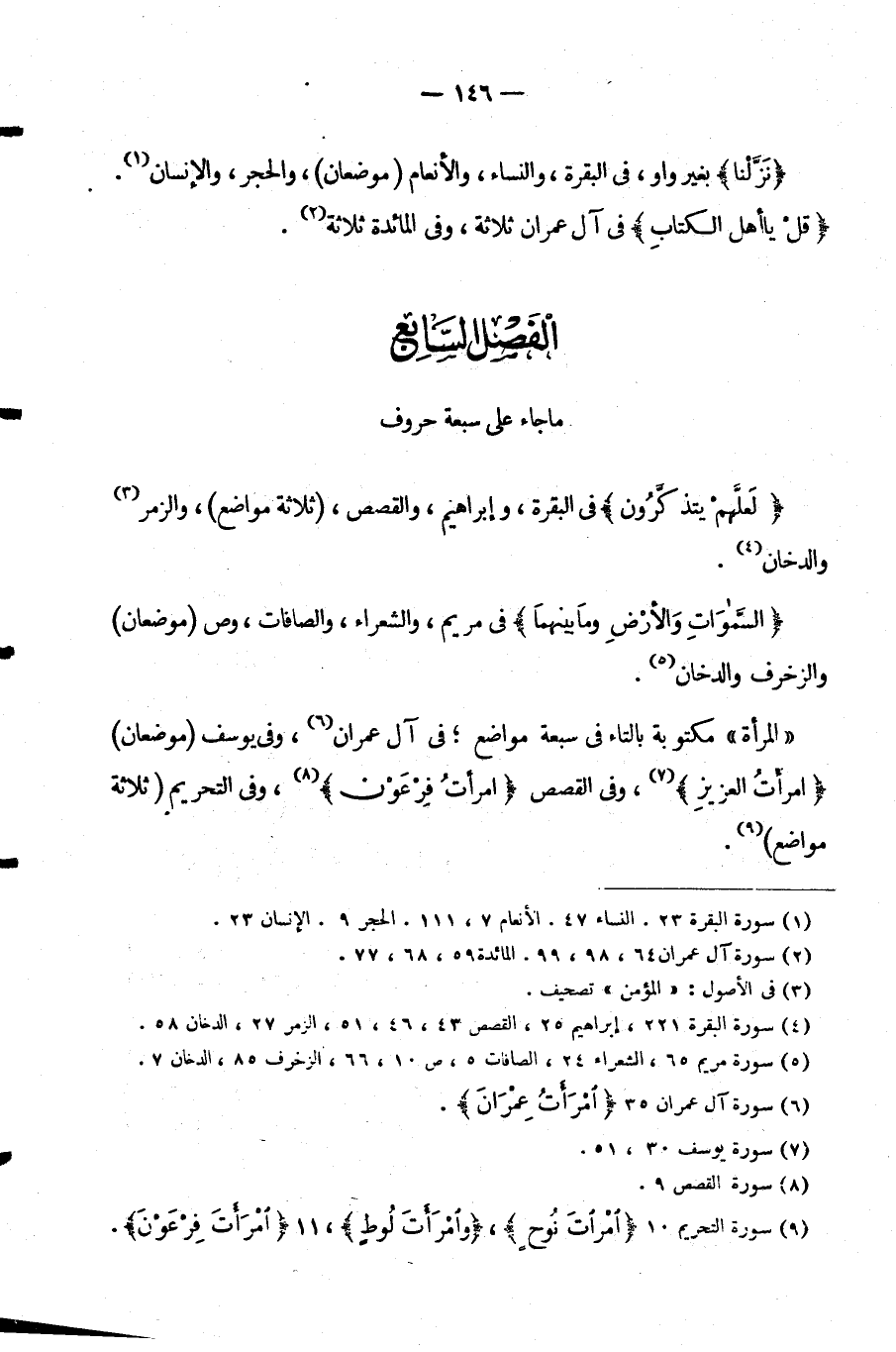 الْمَرْأَةُ مَكْتُوبَةٌ بِالتَّاءِ فِي سَبْعَةِ مَوَاضِعَ فِي آل عمران وفي يوسف موضعان {امرأت العزيز} وفي القصص