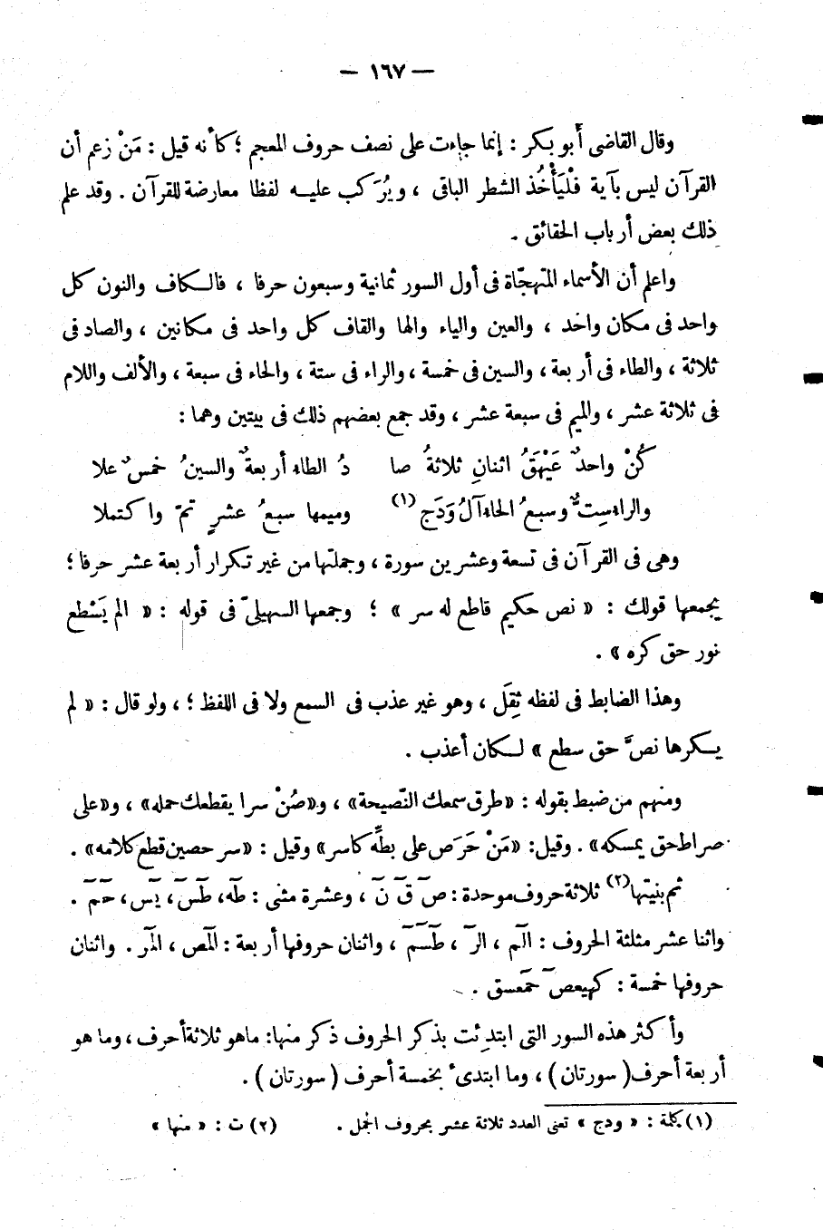 وَاعْلَمْ أَنَّ الْأَسْمَاءَ الْمُتَهَجَّاةَ فِي أَوَّلِ السُّوَرِ ثَمَانِيَةٌ وَسَبْعُونَ حَرْفًا فَالْكَافُ وَالنُّونُ كُلُّ وَاحِدٍ فِي مَكَانٍ وَاحِدٍ وَالْعَيْنُ وَالْيَاءُ وَالْهَاءُ وَالْقَافُ كُلُّ وَاحِدٍ فِي مَكَانَيْنِ وَالصَّادُ فِي ثَلَاثَةٍ وَالطَّاءُ فِي أَرْبَعَةٍ وَالسِّينُ فِي خَمْسَةٍ وَالرَّاءُ فِي سِتَّةٍ وَالْحَاءُ فِي سَبْعَةٍ وَالْأَلِفُ وَاللَّامُ فِي ثَلَاثَةَ عَشَرَ وَالْمِيمُ فِي سَبْعَةَ عَشَرَ وَقَدْ جَمَعَ بَعْضُهُمْ ذَلِكَ فِي بَيْتَيْنِ وَهُمَا