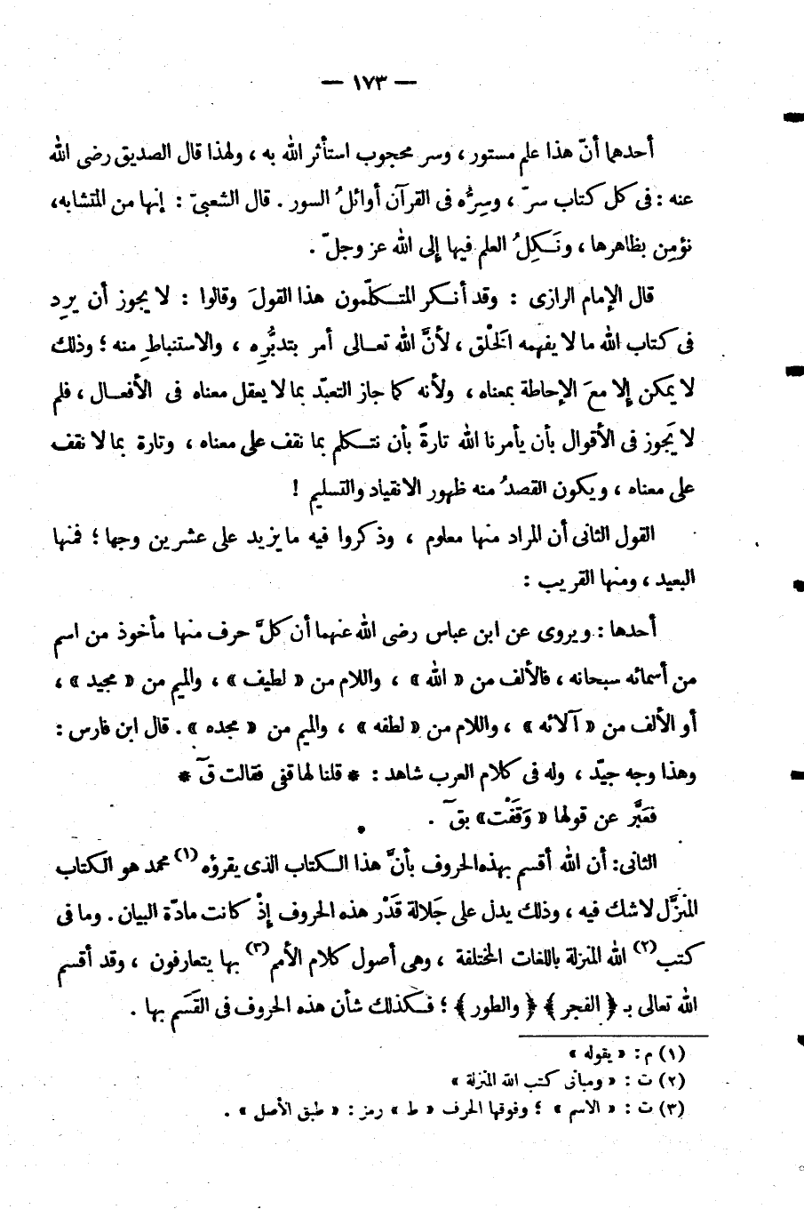 قَالَ الْإِمَامُ الرَّازِيُّ وَقَدْ أَنْكَرَ الْمُتَكَلِّمُونَ هَذَا الْقَوْلَ وَقَالُوا لَا يَجُوزُ أَنْ يَرِدَ فِي كِتَابِ اللَّهِ مَا لَا يَفْهَمُهُ الْخَلْقُ لِأَنَّ اللَّهَ تَعَالَى أَمَرَ بِتَدَبُّرِهِ وَالِاسْتِنْبَاطِ مِنْهُ وَذَلِكَ لَا يُمْكِنُ إِلَّا مَعَ الْإِحَاطَةِ بِمَعْنَاهُ وَلِأَنَّهُ كَمَا جَازَ التَّعَبُّدُ بِمَا لَا يُعْقَلُ مَعْنَاهُ فِي الْأَفْعَالِ فَلِمَ لَا يَجُوزُ فِي الْأَقْوَالِ بِأَنْ يَأْمُرَنَا اللَّهُ تَارَةً بِأَنْ نَتَكَلَّمَ بِمَا نَقِفُ عَلَى مَعْنَاهُ وَتَارَةً بِمَا لَا نَقِفُ عَلَى مَعْنَاهُ وَيَكُونُ الْقَصْدُ مِنْهُ ظُهُورَ الِانْقِيَادِ وَالتَّسْلِيمِ.