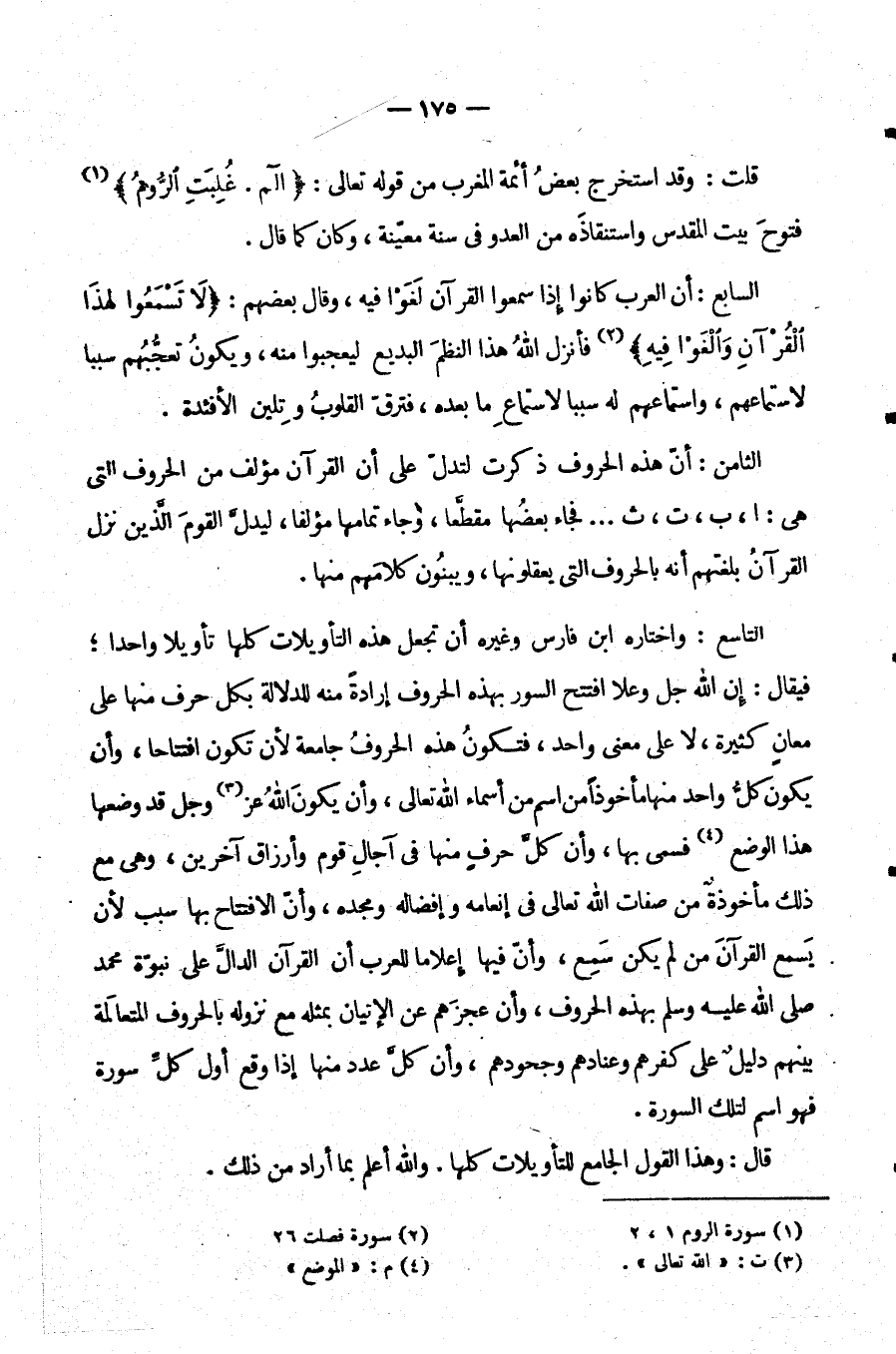 التَّاسِعُ: وَاخْتَارَهُ ابْنُ فَارِسٍ وَغَيْرُهُ أَنْ تُجْعَلَ هَذِهِ التَّأْوِيلَاتُ كُلُّهَا تَأْوِيلًا وَاحِدًا فَيُقَالُ إِنَّ اللَّهَ جَلَّ وَعَلَا افْتَتَحَ السُّوَرَ بِهَذِهِ الْحُرُوفِ إِرَادَةً مِنْهُ لِلدَّلَالَةِ بِكُلِّ حَرْفٍ مِنْهَا عَلَى مَعَانٍ كَثِيرَةٍ لَا عَلَى مَعْنًى وَاحِدٍ فَتَكُونُ هَذِهِ الْحُرُوفُ جَامِعَةً لِأَنْ تَكُونَ افْتِتَاحًا وَأَنْ يَكُونَ كُلُّ وَاحِدٍ مِنْهَا مَأْخُوذًا مِنِ اسْمٍ مِنْ أَسْمَاءِ اللَّهِ تَعَالَى وَأَنْ يَكُونَ اللَّهُ عَزَّ وَجَلَّ قَدْ وَضَعَهَا هَذَا الْوَضْعَ فَسَمَّى بِهَا وَأَنَّ كُلَّ حَرْفٍ مِنْهَا فِي آجَالِ قَوْمٍ وَأَرْزَاقِ آخَرِينَ وَهِيَ مَعَ ذَلِكَ مَأْخُوذَةٌ مِنْ صِفَاتِ اللَّهِ تَعَالَى فِي إِنْعَامِهِ وَإِفْضَالِهِ وَمَجْدِهِ وَأَنَّ الِافْتِتَاحَ بِهَا سَبَبٌ لِأَنْ يَسْمَعَ الْقُرْآنَ مَنْ لَمْ يَكُنْ سَمِعَ وَأَنَّ فِيهَا إِعْلَامًا لِلْعَرَبِ أَنَّ الْقُرْآنَ الدَّالَّ عَلَى نُبُوَّةِ مُحَمَّدٍ صَلَّى اللَّهُ عَلَيْهِ وَسَلَّمَ بِهَذِهِ الْحُرُوفِ وَأَنَّ عَجْزَهُمْ عَنِ الْإِتْيَانِ بِمِثْلِهِ مَعَ نُزُولِهِ بِالْحُرُوفِ الْمُتَعَالِمَةِ بَيْنَهُمْ دَلِيلٌ عَلَى كُفْرِهِمْ وَعِنَادِهِمْ وَجُحُودِهِمْ وَأَنَّ كُلَّ عَدَدٍ مِنْهَا إِذَا وَقَعَ أَوَّلَ كُلِّ سُورَةٍ فَهُوَ اسْمٌ لِتِلْكَ السُّورَةِ