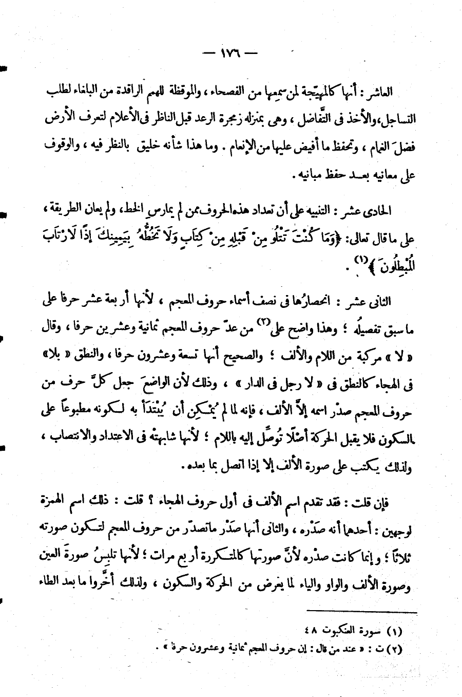 الثَّانِيَ عَشَرَ: انْحِصَارُهَا فِي نِصْفِ أَسْمَاءِ حُرُوفِ الْمُعْجَمِ لِأَنَّهَا أَرْبَعَةَ عَشَرَ حَرْفًا عَلَى مَا سَبَقَ تَفْصِيلُهُ وَهَذَا وَاضِحٌ عَلَى مَنْ عَدَّ حُرُوفَ الْمُعْجَمِ ثَمَانِيَةً وَعِشْرِينَ حَرْفًا وَقَالَ لَا مُرَكَّبَةٌ مِنَ اللَّامِ وَالْأَلِفِ وَالصَّحِيحُ أَنَّهَا تِسْعَةٌ وَعِشْرُونَ حَرْفًا وَالنُّطْقُ بِلَا فِي الْهِجَاءِ كَالنُّطْقِ فِي لَا رَجُلَ فِي الدَّارِ وَذَلِكَ لِأَنَّ الْوَاضِعَ جَعَلَ كُلَّ حَرْفٍ مِنْ حُرُوفِ الْمُعْجَمِ صَدْرَ اسْمِهِ إِلَّا الْأَلِفَ فَإِنَّهُ لَمَّا لَمْ يُمْكِنْ أَنْ يُبْتَدَأَ بِهِ لِكَوْنِهِ مَطْبُوعًا عَلَى السُّكُونِ فَلَا يَقْبَلُ الْحَرَكَةَ أَصْلًا تُوِصِّلَ إِلَيْهِ بِاللَّامِ لِأَنَّهَا شَابَهَتْهُ فِي الِاعْتِدَادِ وَالِانْتِصَابِ وَلِذَلِكَ يُكْتَبُ عَلَى صُورَةِ الْأَلِفِ إِلَّا إِذَا اتَّصَلَ بِمَا بَعْدَهُ