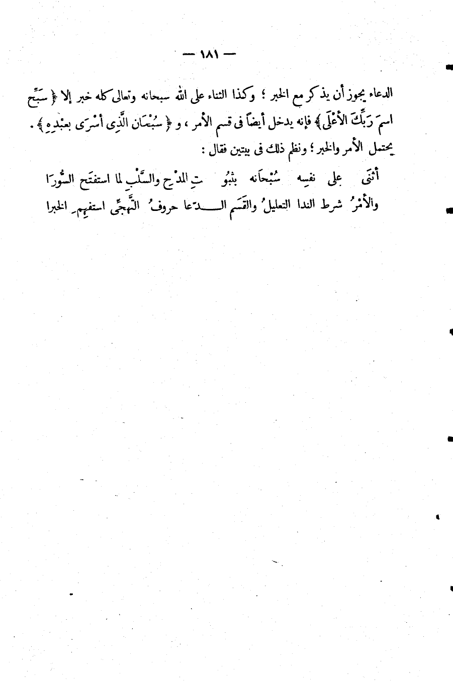 الدُّعَاءِ يَجُوزُ أَنْ يُذْكَرَ مَعَ الْخَبَرِ وَكَذَا الثَّنَاءُ عَلَى اللَّهِ سُبْحَانَهُ وَتَعَالَى كُلُّهُ خَبَرٌ إِلَّا: {سَبِّحِ اسْمَ رَبِّكَ الْأَعْلَى} فَإِنَّهُ يَدْخُلُ أَيْضًا فِي