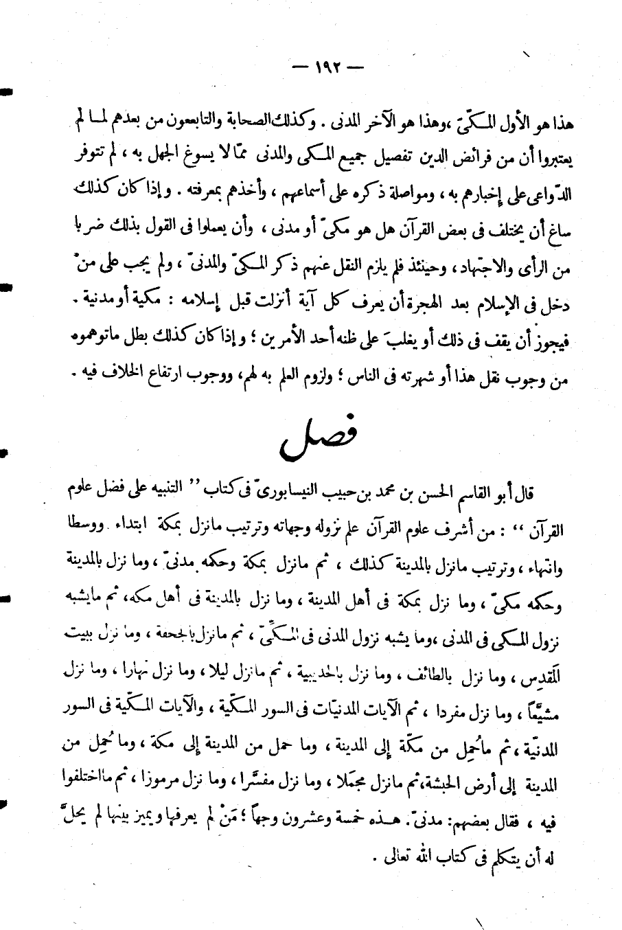قَالَ أَبُو الْقَاسِمِ الْحَسَنُ بْنُ مُحَمَّدِ بْنِ حَبِيبٍ النَّيْسَابُورِيُّ فِي كِتَابِ التَّنْبِيهِ عَلَى فَضْلِ عُلُومِ الْقُرْآنِ مِنْ أَشْرَفِ عُلُومِ الْقُرْآنِ عِلْمُ نُزُولِهِ وَجِهَاتِهِ وَتَرْتِيبِ مَا نَزَلَ بِمَكَّةَ ابْتِدَاءً وَوَسَطًا وَانْتِهَاءً وَتَرْتِيبِ مَا نَزَلَ بِالْمَدِينَةِ كَذَلِكَ ثُمَّ مَا نَزَلَ بِمَكَّةَ وَحُكْمُهُ مَدَنِيٌّ وَمَا نَزَلَ بِالْمَدِينَةِ وَحُكْمُهُ مَكِّيٌّ وَمَا نَزَلَ بِمَكَّةَ فِي أَهْلِ الْمَدِينَةِ وَمَا نَزَلَ بِالْمَدِينَةِ فِي أَهْلِ مَكَّةَ ثُمَّ مَا يُشْبِهُ نُزُولَ الْمَكِّيِّ فِي الْمَدَنِيِّ وَمَا يُشْبِهُ نُزُولَ الْمَدَنِيِّ فِي الْمَكِّيِّ ثُمَّ مَا نَزَلَ بِالْجُحْفَةِ وَمَا نَزَلَ بِبَيْتِ الْمَقْدِسِ وَمَا نَزَلَ بِالطَّائِفِ وَمَا نَزَلَ بِالْحُدَيْبِيَةِ ثُمَّ مَا نَزَلَ لَيْلًا وَمَا نَزَلَ نَهَارًا وَمَا نَزَلَ مُشَيَّعًا وَمَا نَزَلَ مُفْرَدًا ثُمَّ الْآيَاتِ الْمُدْنِيَاتِ فِي السُّوَرِ الْمَكِّيَّةِ وَالْآيَاتِ الْمَكِّيَّةِ فِي السُّوَرِ الْمَدَنِيَّةِ ثُمَّ مَا حُمِلَ مِنْ مَكَّةَ إِلَى الْمَدِينَةِ وَمَا حُمِلَ مِنَ الْمَدِينَةِ إِلَى مَكَّةَ وَمَا حُمِلَ مِنَ الْمَدِينَةِ إِلَى أَرْضِ الْحَبَشَةِ ثُمَّ مَا نَزَلَ مُجْمَلًا وَمَا نَزَلَ مُفَسَّرًا وَمَا نَزَلَ مَرْمُوزًا ثُمَّ مَا اخْتَلَفُوا فِيهِ فَقَالَ بَعْضُهُمْ مَدَنِيٌّ هَذِهِ خَمْسَةُ وَعِشْرُونَ وَجْهًا مَنْ لَمْ يَعْرِفْهَا وَيُمَيِّزْ بَيْنَهَا لَمْ يَحِلَّ لَهُ أَنْ يَتَكَلَّمَ فِي كِتَابِ اللَّهِ تعالى