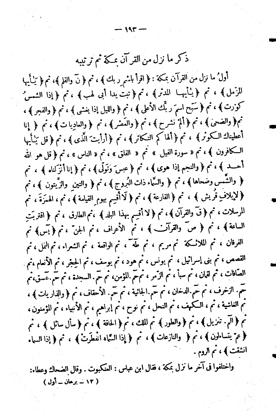 أَوَّلُ مَا نَزَلَ مِنَ الْقُرْآنِ بِمَكَّةَ: {اقْرَأْ بِاسْمِ رَبِّكَ} ثُمَّ {ن وَالْقَلَمِ} ثُمَّ {يا أيها المزمل} ثم {يا أيها الْمُدَّثِّرُ} ثُمَّ {تَبَّتْ يَدَا أَبِي لَهَبٍ} ثُمَّ {إِذَا الشَّمْسُ كُوِّرَتْ} ثُمَّ {سَبِّحِ اسْمَ رَبِّكَ الْأَعْلَى} ثُمَّ {وَاللَّيْلِ إِذَا يَغْشَى} ثُمَّ {وَالْفَجْرِ} ثُمَّ {وَالضُّحَى} ثُمَّ {أَلَمْ نَشْرَحْ} ثُمَّ {وَالْعَصْرِ} ثُمَّ {وَالْعَادِيَاتِ} ثُمَّ {إِنَّا أَعْطَيْنَاكَ الْكَوْثَرَ} ثُمَّ {أَلْهَاكُمُ التَّكَاثُرُ} ثُمَّ {أَرَأَيْتَ الَّذِي} ثُمَّ {قُلْ يا أيها الْكَافِرُونَ} ثُمَّ سُورَةُ الْفِيلِ ثُمَّ الْفَلَقِ ثُمَّ النَّاسِ ثُمَّ {قُلْ هُوَ اللَّهُ أَحَدٌ} ثُمَّ {وَالنَّجْمِ إِذَا هَوَى} ثُمَّ {عَبَسَ وَتَوَلَّى} ثُمَّ {إِنَّا أَنْزَلْنَاهُ} ثُمَّ {وَالشَّمْسِ وَضُحَاهَا} ثُمَّ {وَالسَّمَاءِ ذَاتِ الْبُرُوجِ} ثُمَّ {وَالتِّينِ وَالزَّيْتُونِ} ثُمَّ {لِإِيلَافِ قُرَيْشٍ} ثُمَّ {الْقَارِعَةِ} ثُمَّ {لَا أُقْسِمُ بِيَوْمِ الْقِيَامَةِ} ثُمَّ الْهُمَزَةِ ثُمَّ الْمُرْسَلَاتِ ثُمَّ {ق وَالْقُرْآنِ} ثُمَّ {لَا أُقْسِمُ بِهَذَا الْبَلَدِ} ثُمَّ الطَّارِقِ ثُمَّ {اقْتَرَبَتِ السَّاعَةُ} ثُمَّ {ص وَالْقُرْآنِ} ثُمَّ الْأَعْرَافِ ثُمَّ الْجِنِّ ثُمَّ {يس} ثُمَّ الْفُرْقَانِ ثُمَّ الْمَلَائِكَةِ ثُمَّ مَرْيَمَ ثُمَّ طه ثُمَّ الْوَاقِعَةِ ثُمَّ الشُّعَرَاءِ ثُمَّ النَّمْلِ ثُمَّ الْقَصَصِ ثُمَّ بَنِي إِسْرَائِيلَ ثُمَّ يُونُسَ ثُمَّ هُودٍ ثُمَّ يُوسُفَ ثُمَّ الْحِجْرِ ثُمَّ الْأَنْعَامِ ثُمَّ الصَّافَّاتِ ثُمَّ لُقْمَانَ ثُمَّ سَبَأٍ ثُمَّ الزُّمَرِ ثُمَّ حم الْمُؤْمِنِ ثُمَّ حم السَّجْدَةِ ثُمَّ حم عسق ثُمَّ حم الزُّخْرُفِ ثُمَّ حم الدُّخَانِ ثُمَّ حم الْجَاثِيَةِ ثُمَّ حم الْأَحْقَافِ ثُمَّ وَالذَّارِيَاتِ ثُمَّ الْغَاشِيَةِ ثُمَّ الْكَهْفِ ثُمَّ النَّحْلِ ثُمَّ نُوحٍ ثُمَّ إِبْرَاهِيمَ ثُمَّ الْأَنْبِيَاءِ ثُمَّ الْمُؤْمِنُونَ ثُمَّ {الم تَنْزِيلُ} ثُمَّ {وَالطُّورِ} ثُمَّ الْمُلْكِ ثُمَّ {الْحَاقَّةُ} ثُمَّ {سَأَلَ سَائِلٌ} ثُمَّ {عَمَّ يَتَسَاءَلُونَ} ثُمَّ {وَالنَّازِعَاتِ} ثُمَّ {إِذَا السَّمَاءُ انْفَطَرَتْ} ثُمَّ {إِذَا السَّمَاءُ انْشَقَّتْ} ثم الروم