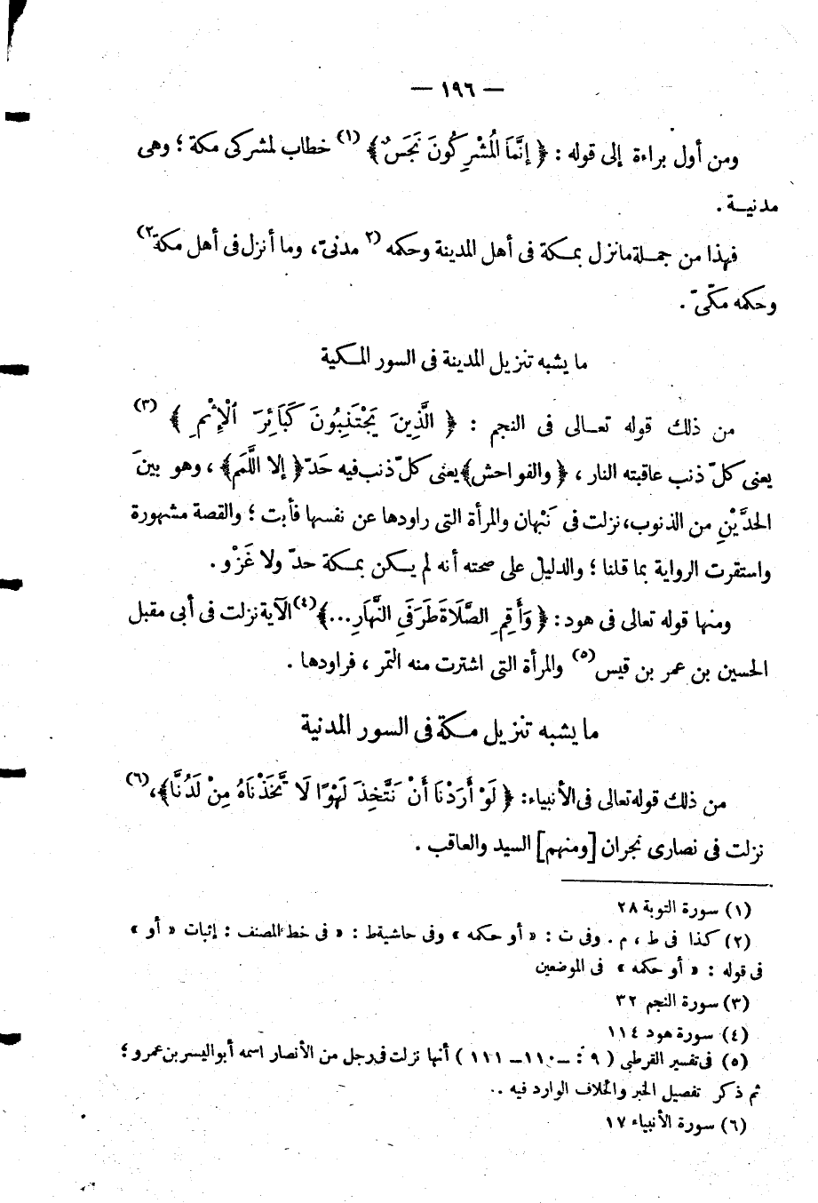 مِنْ ذَلِكَ قَوْلُهُ تَعَالَى فِي النَّجْمِ {الَّذِينَ يَجْتَنِبُونَ كَبَائِرَ الأثم} يعني كل ذنب عاقبته النار {والفواحش} يَعْنِي كُلَّ ذَنْبٍ فِيهِ حَدٌّ {إِلَّا اللَّمَمَ} وَهُوَ بَيْنَ الْحَدَّيْنِ مِنَ الذُّنُوبِ نَزَلَتْ فِي نَبْهَانَ وَالْمَرْأَةِ الَّتِي رَاوَدَهَا عَنْ نَفْسِهَا فَأَبَتْ وَالْقِصَّةُ مَشْهُورَةٌ وَاسْتَقَرَّتِ الرِّوَايَةُ بِمَا قُلْنَا وَالدَّلِيلُ عَلَى صِحَّتِهِ أَنَّهُ لَمْ يَكُنْ بِمَكَّةَ حَدٌّ وَلَا غَزْوٌ.