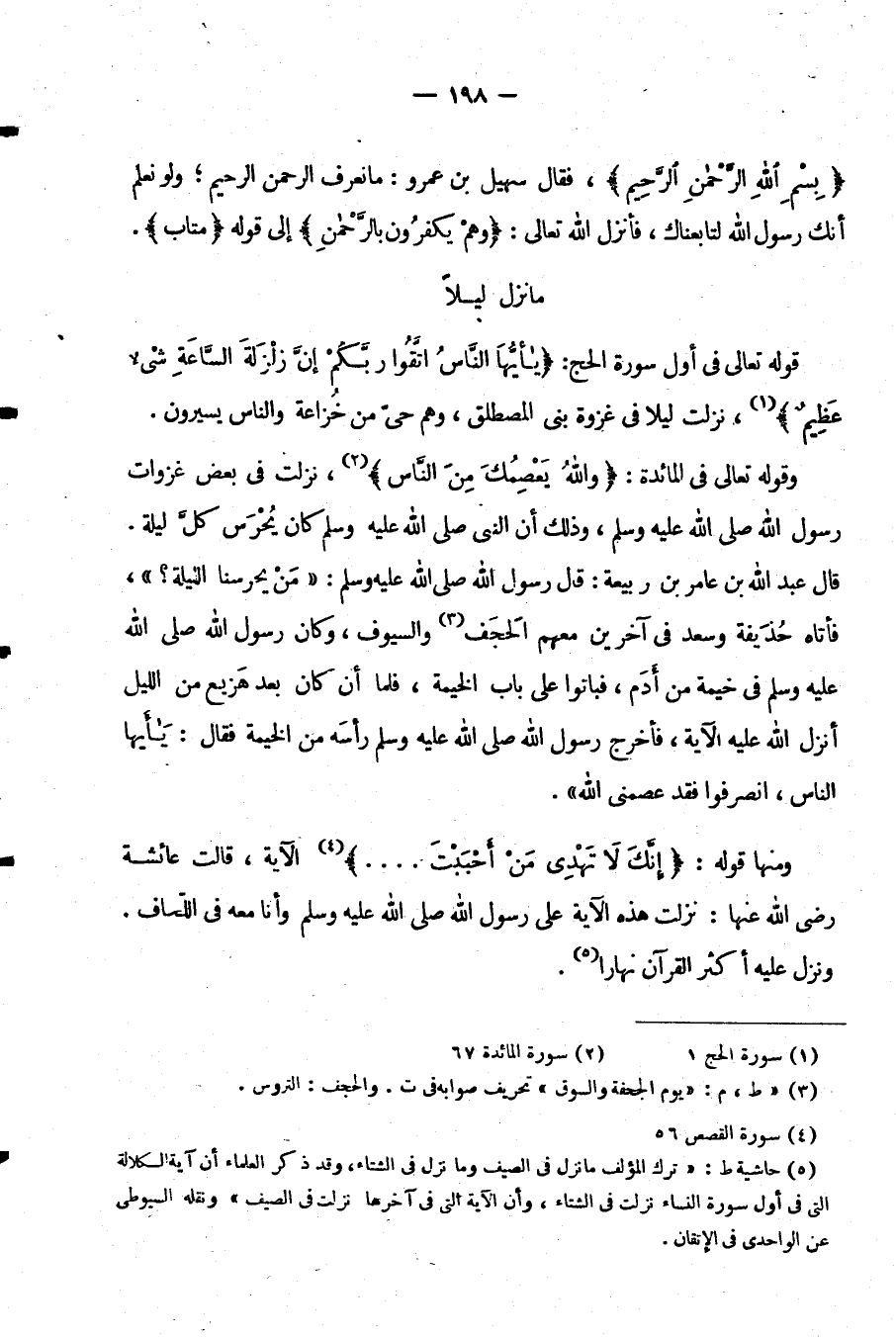 قَوْلُهُ تَعَالَى: فِي أَوَّلِ سورة الحج {يا أيها النَّاسُ اتَّقُوا رَبَّكُمْ إِنَّ زَلْزَلَةَ السَّاعَةِ شَيْءٌ عظيم} نَزَلَتْ لَيْلًا فِي غَزْوَةِ بَنِي الْمُصْطَلِقِ وَهُمْ حَيٌّ مِنْ خُزَاعَةَ وَالنَّاسُ يَسِيرُونَ