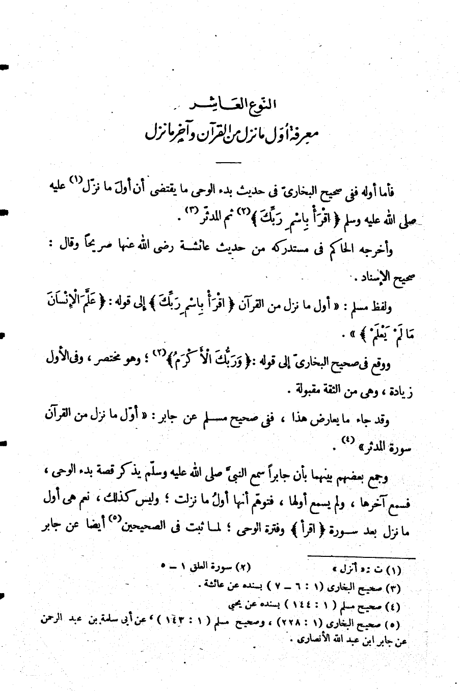 النَّوْعُ الْعَاشِرُ: مَعْرِفَةُ أَوَّلِ مَا نَزَلَ مِنَ الْقُرْآنِ وَآخِرِ مَا نَزَلَ