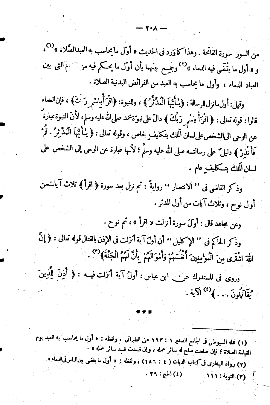 مِنَ السُّوَرِ سُورَةُ الْفَاتِحَةِ وَهَذَا كَمَا وَرَدَ فِي الْحَدِيثِ "أَوَّلُ مَا يُحَاسَبُ بِهِ الْعَبْدُ الصَّلَاةُ" "وَأَوَّلُ مَا يُقْضَى فِيهِ الدِّمَاءُ" وَجُمِعَ بَيْنَهُمَا بِأَنَّ أَوَّلَ مَا يُحْكَمُ فِيهِ مِنَ الْمَظَالِمِ الَّتِي بَيْنَ الْعِبَادِ الدِّمَاءُ وَأَوَّلَ مَا يُحَاسَبُ بِهِ الْعَبْدُ مِنَ الْفَرَائِضِ الْبَدَنِيَّةِ الصَّلَاةُ