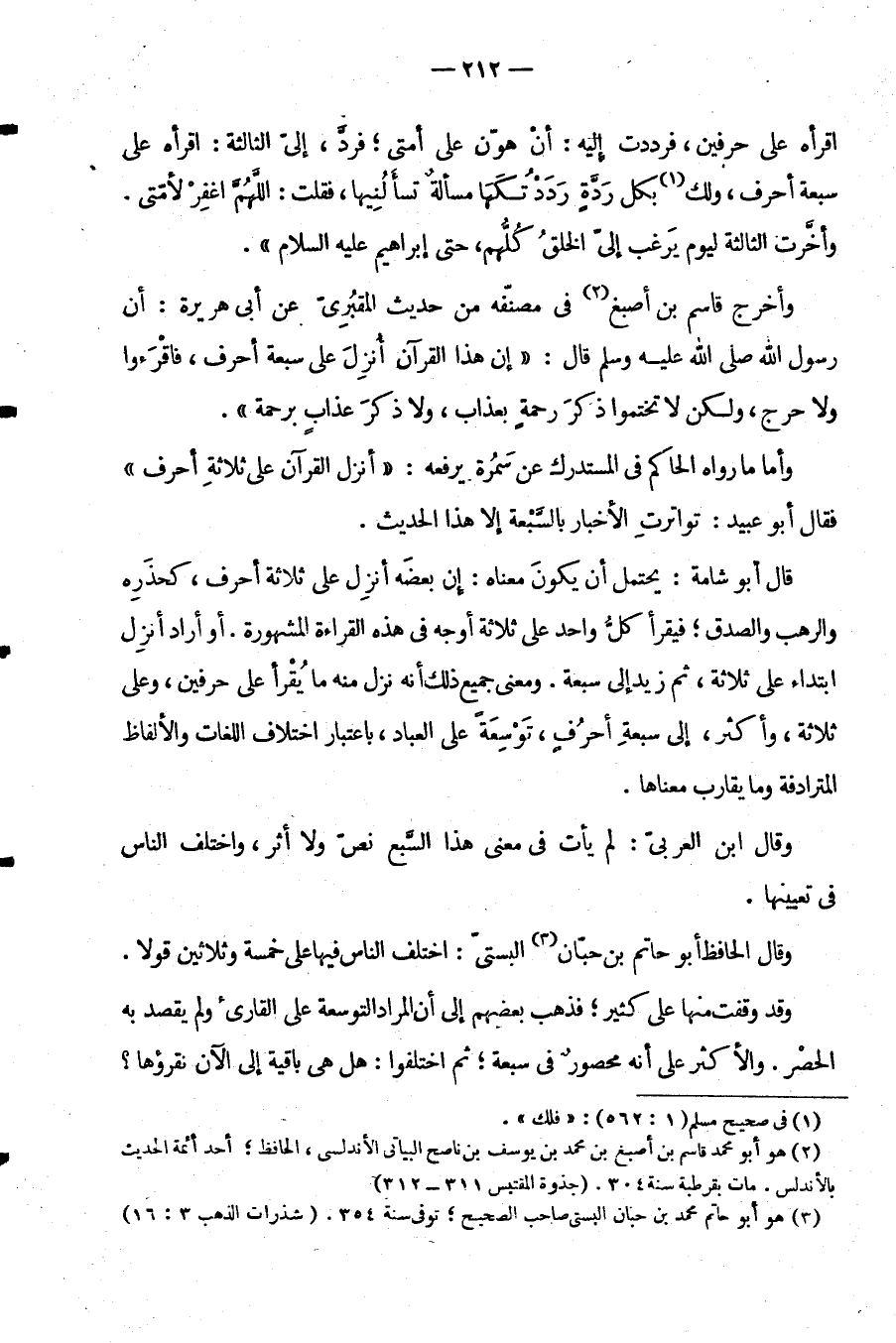 وَقَالَ الْحَافِظُ أَبُو حَاتِمِ بْنُ حِبَّانَ الْبَسْتِيُّ اخْتَلَفَ النَّاسُ فِيهَا عَلَى خَمْسَةٍ وَثَلَاثِينَ قَوْلًا وَقَالَ وَقَفْتُ مِنْهَا عَلَى كَثِيرٍ فَذَهَبَ بَعْضُهُمْ إِلَى أَنَّ الْمُرَادَ التَّوْسِعَةُ عَلَى الْقَارِئِ وَلَمْ يَقْصِدْ بِهِ الْحَصْرَ وَالْأَكْثَرُ عَلَى أَنَّهُ مَحْصُورٌ فِي سَبْعَةٍ ثُمَّ اخْتَلَفُوا هَلْ هِيَ بَاقِيَةٌ إِلَى الْآنَ نَقْرَؤُهَا؟