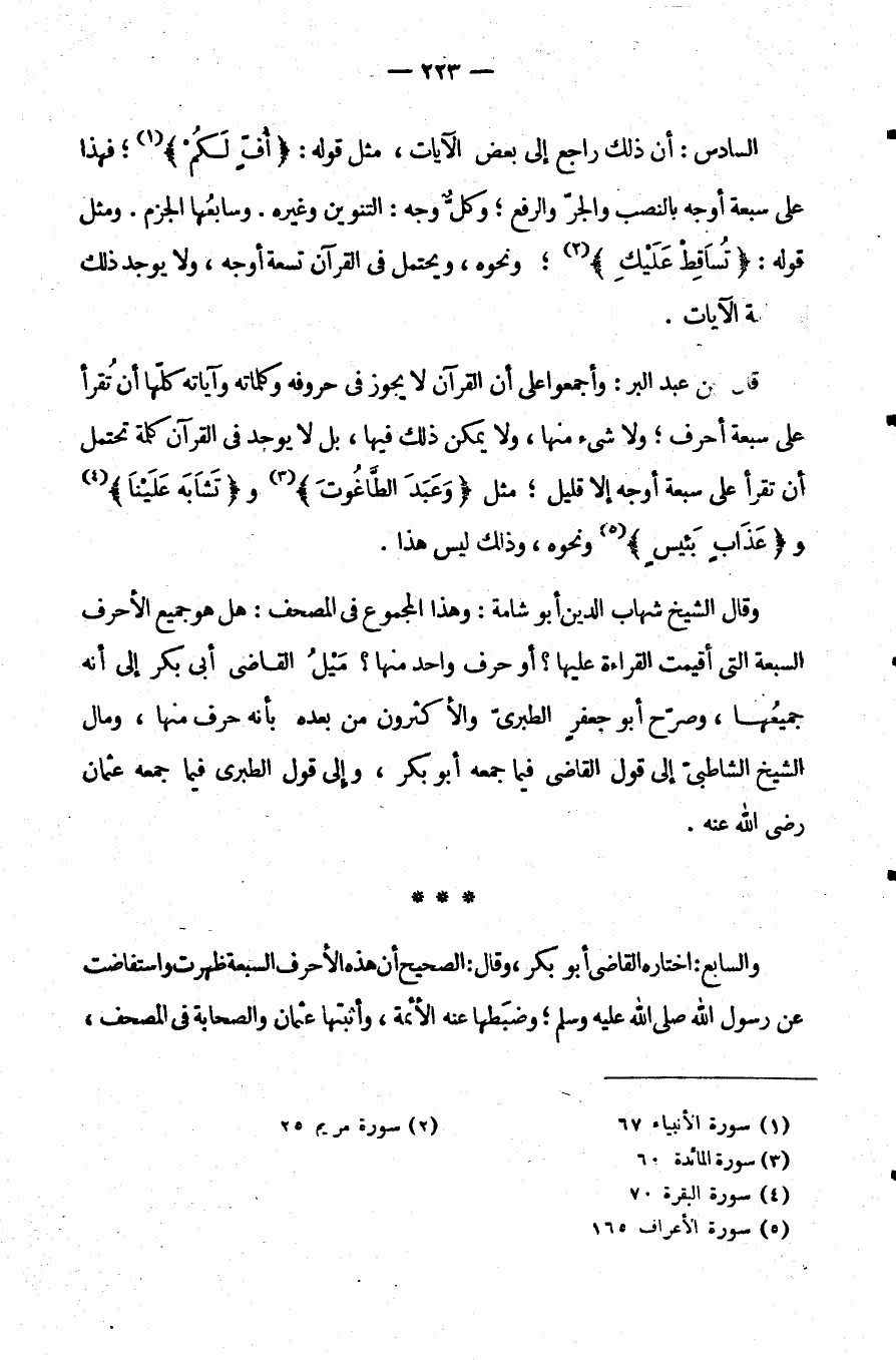 وَقَالَ الشَّيْخُ: شِهَابُ الدِّينِ أَبُو شَامَةَ وَهَذَا الْمَجْمُوعُ فِي الْمُصْحَفِ هَلْ هُوَ جَمِيعُ الْأَحْرُفِ السَّبْعَةِ الَّتِي أُقِيمَتِ الْقِرَاءَةُ عَلَيْهَا أَوْ حَرْفٌ وَاحِدٌ مِنْهَا مَيْلُ الْقَاضِي أَبِي بَكْرٍ إِلَى أَنَّهُ جَمِيعُهَا وَصَرَّحَ أَبُو جَعْفَرٍ الطَّبَرِيُّ وَالْأَكْثَرُونَ مِنْ بَعْدِهِ بِأَنَّهُ حَرْفٌ مِنْهَا وَمَالَ الشَّيْخُ الشَّاطِبِيُّ إِلَى قَوْلِ الْقَاضِي فِيمَا جَمَعَهُ أَبُو بَكْرٍ وَإِلَى قَوْلِ الطَّبَرِيِّ فِيمَا جَمَعَهُ عُثْمَانُ رَضِيَ اللَّهُ عَنْهُ وَالسَّابِعُ: اخْتَارَهُ الْقَاضِي أَبُو بَكْرٍ وَقَالَ الصَّحِيحُ أَنَّ هَذِهِ الْأَحْرُفَ السَّبْعَةَ ظَهَرَتْ وَاسْتَفَاضَتْ عَنْ رَسُولِ اللَّهِ صَلَّى اللَّهُ عَلَيْهِ وَسَلَّمَ وَضَبَطَهَا عَنْهُ الْأَئِمَّةُ وَأَثْبَتَهَا عُثْمَانُ وَالصَّحَابَةُ فِي الْمُصْحَفِ