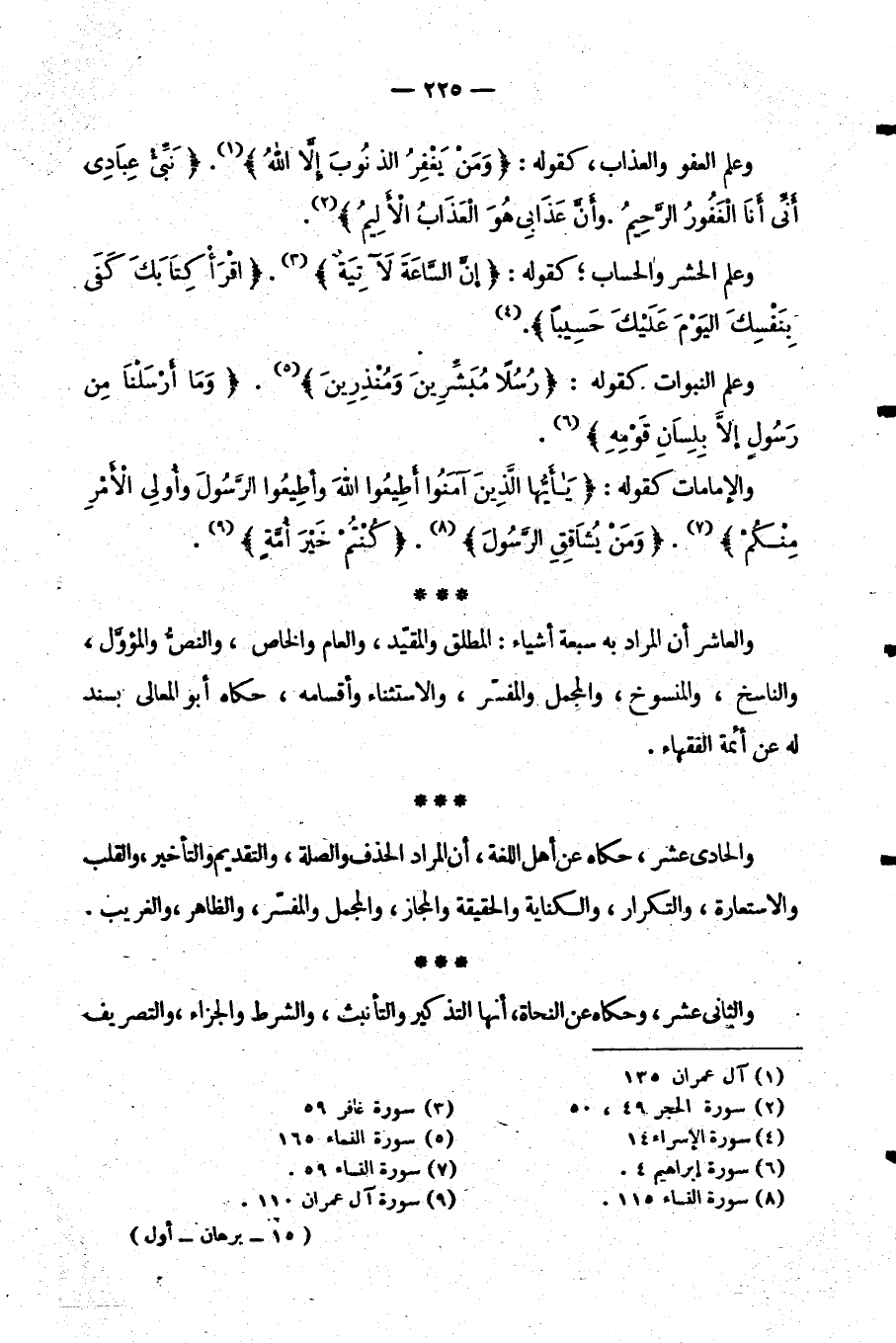 وَعِلْمُ الْحَشْرِ وَالْحِسَابِ كَقَوْلِهِ: {إِنَّ السَّاعَةَ لَآتِيَةٌ} {اقْرَأْ كِتَابَكَ كَفَى بِنَفْسِكَ الْيَوْمَ عَلَيْكَ حَسِيبًا} وعلم النبوات كقوله: {رسلا مبشرين ومنذرين} {وَمَا أَرْسَلْنَا مِنْ رَسُولٍ إِلَّا بِلِسَانِ قَوْمِهِ} والإمامات كقوله: {يا أيها الَّذِينَ آمَنُوا أَطِيعُوا اللَّهَ وَأَطِيعُوا الرَّسُولَ وَأُولِي الأمر منكم} {ومن يشاقق الرسول}