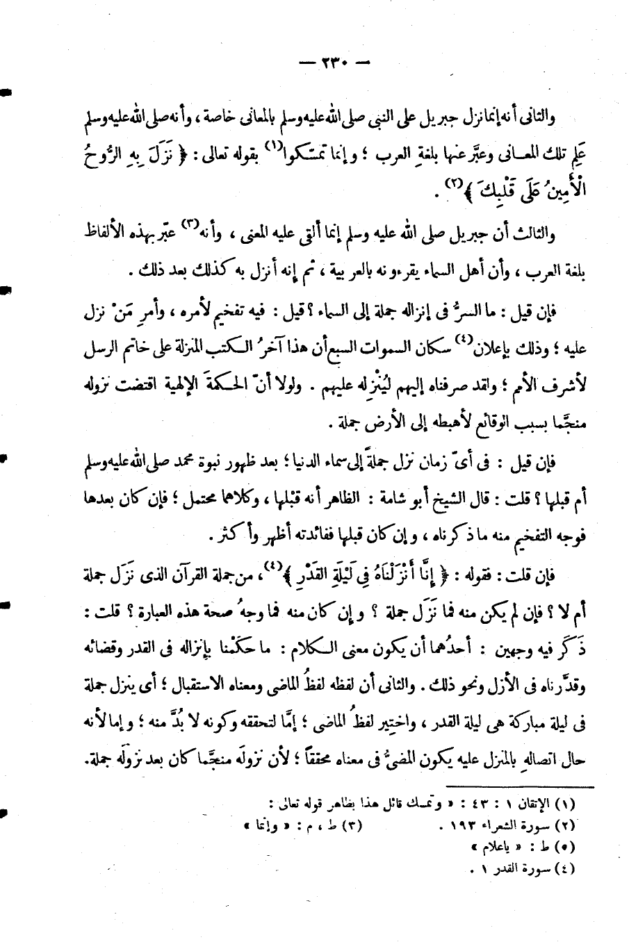 فَإِنْ قِيلَ: فِي أَيِّ زَمَانٍ نَزَلَ جُمْلَةً إِلَى سَمَاءِ الدُّنْيَا بَعْدَ ظُهُورِ نُبُوَّةِ مُحَمَّدٍ صَلَّى اللَّهُ عَلَيْهِ وَسَلَّمَ أَمْ قَبْلَهَا قُلْتُ قَالَ الشَّيْخُ أَبُو شَامَةَ الظَّاهِرُ أَنَّهُ قَبْلَهَا وَكِلَاهُمَا مُحْتَمَلٌ فَإِنْ كَانَ بَعْدَهَا فَوَجْهُ التَّفْخِيمِ مِنْهُ مَا ذَكَرْنَاهُ وَإِنْ كَانَ قَبْلَهَا فَفَائِدَتُهُ أَظْهَرُ وَأَكْثَرُ