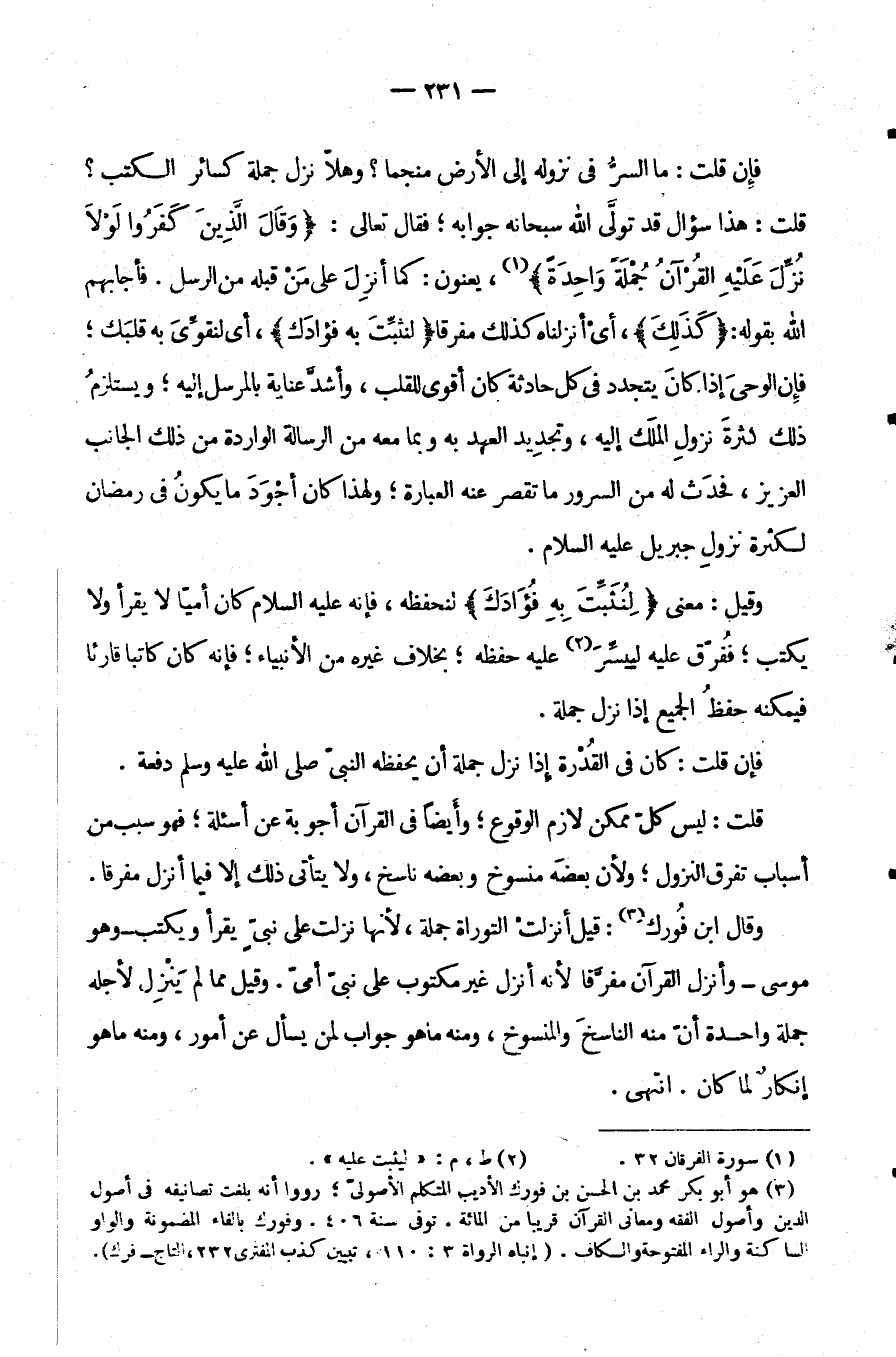 وَقَالَ ابْنُ فُورَكٍ: قِيلَ أُنْزِلَتِ التَّوْرَاةُ جُمْلَةً لِأَنَّهَا نَزَلَتْ عَلَى نَبِيٍّ يَقْرَأُ وَيَكْتُبُ وَهُوَ مُوسَى وَأُنْزِلَ الْقُرْآنُ مُفَرَّقًا لِأَنَّهُ أُنْزِلَ غَيْرَ مَكْتُوبٍ عَلَى نَبِيٍّ أُمِّيٍّ وَقِيلَ مِمَّا لَمْ يَنْزِلْ لِأَجْلِهِ جُمْلَةً وَاحِدَةً أَنَّ مِنْهُ النَّاسِخَ وَالْمَنْسُوخَ وَمِنْهُ مَا هُوَ جَوَابٌ لِمَنْ يَسْأَلُ عَنْ أُمُورٍ وَمِنْهُ مَا هُوَ إِنْكَارٌ لِمَا كَانَ انْتَهَى