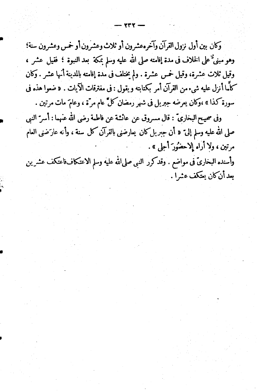 وَكَانَ بَيْنَ أَوَّلِ نُزُولِ الْقُرْآنِ وَآخِرِهِ عِشْرُونَ أَوْ ثَلَاثٌ وَعِشْرُونَ أَوْ خَمْسٌ وَعِشْرُونَ سَنَةً وَهُوَ مَبْنِيٌّ عَلَى الْخِلَافِ فِي مُدَّةِ إِقَامَتِهِ صَلَّى اللَّهُ عَلَيْهِ وَسَلَّمَ بِمَكَّةَ بَعْدَ النُّبُوَّةِ فَقِيلَ عَشْرٌ وَقِيلَ ثَلَاثَ عَشْرَةَ وَقِيلَ خَمْسَ عَشْرَةَ وَلَمْ يُخْتَلَفْ فِي مُدَّةِ إِقَامَتِهِ بِالْمَدِينَةِ أَنَّهَا عَشْرٌ وَكَانَ كُلَّمَا أُنْزِلَ عَلَيْهِ شَيْءٌ مِنَ الْقُرْآنِ أَمَرَ بِكِتَابَتِهِ وَيَقُولُ فِي مُفْتَرِقَاتِ الْآيَاتِ ضَعُوا هَذِهِ فِي سُورَةِ كَذَا وَكَانَ يَعْرِضُهُ جِبْرِيلُ فِي شَهْرِ رَمَضَانَ كُلَّ عَامٍ مَرَّةً وَعَامَ مَاتَ مَرَّتَيْنِ