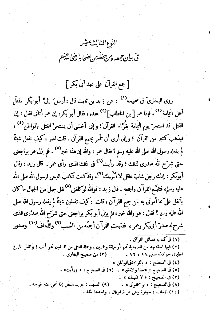 رَوَى الْبُخَارِيُّ فِي صَحِيحِهِ عَنْ زَيْدِ بْنِ ثَابِتٍ قَالَ أَرْسَلَ إِلَيَّ أَبُو بَكْرٍ مَقْتَلَ أهل اليمامة فإذا عمر بن الخطاب عِنْدَهُ فَقَالَ أَبُو بَكْرٍ إِنَّ عُمَرَ أَتَانِي فَقَالَ إِنَّ الْقَتْلَ قَدِ اسْتَحَرَّ بِيَوْمِ الْيَمَامَةِ بِقُرَّاءِ الْقُرْآنِ وَإِنِّي أَخْشَى أَنْ يَسْتَحِرَّ الْقَتْلُ بِالْمَوَاطِنِ فَيَذْهَبَ كَثِيرٌ مِنَ الْقُرْآنِ وَإِنِّي أَرَى أَنْ تَأْمُرَ بِجَمْعِ الْقُرْآنِ قُلْتُ لِعُمَرَ كَيْفَ نَفْعَلُ شَيْئًا لَمْ يَفْعَلْهُ رَسُولُ اللَّهِ صَلَّى اللَّهُ عَلَيْهِ وَسَلَّمَ فَقَالَ عُمَرُ وَاللَّهِ إِنَّ هَذَا خَيْرٌ فَلَمْ يَزَلْ عُمَرُ يُرَاجِعُنِي حَتَّى شَرَحَ اللَّهُ صَدْرِي لِذَلِكَ وَقَدْ رَأَيْتُ فِي ذَلِكَ الَّذِي رَأَى عُمَرُ قَالَ زَيْدٌ وَقَالَ أَبُو بَكْرٍ إِنَّكَ رَجُلٌ شَابٌّ عَاقِلٌ لَا أَتَّهِمُكَ وَقَدْ كُنْتَ تَكْتُبُ الْوَحْيَ لِرَسُولِ اللَّهِ صَلَّى اللَّهُ عَلَيْهِ وَسَلَّمَ فَتَتَبَّعِ الْقُرْآنَ وَاجْمَعْهُ قال زيد فو الله لوكلفني نَقْلَ جَبَلٍ مِنَ الْجِبَالِ مَا كَانَ بِأَثْقَلَ عَلَيَّ مِمَّا أَمَرَنِي بِهِ مِنْ جَمْعِ الْقُرْآنِ قُلْتُ كَيْفَ تَفْعَلُونَ شَيْئًا لَمْ يَفْعَلْهُ رَسُولُ اللَّهِ صَلَّى اللَّهُ عَلَيْهِ وَسَلَّمَ فَقَالَ هُوَ وَاللَّهِ خَيْرٌ فَلَمْ يَزَلْ أَبُو بَكْرٍ يُرَاجِعُنِي حَتَّى شَرَحَ اللَّهُ صَدْرِي لِلَّذِي شَرَحَ لَهُ صَدْرَ أَبِي بَكْرٍ وَعُمَرَ فَتَتَبَّعْتُ الْقُرْآنَ أَجْمَعُهُ مِنَ الْعُسُبِ وَاللِّخَافِ وَصُدُورِ
