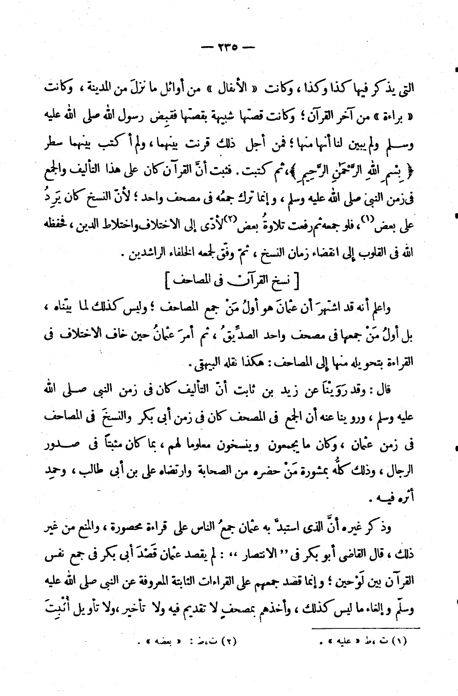 وَاعْلَمْ أَنَّهُ قَدِ اشْتُهِرَ أَنَّ عُثْمَانَ هُوَ أَوَّلُ مَنْ جَمَعَ الْمَصَاحِفَ وَلَيْسَ كَذَلِكَ لِمَا بَيَّنَّاهُ بَلْ أَوَّلُ مَنْ جَمَعَهَا فِي مُصْحَفٍ وَاحِدٍ الصِّدِّيقُ ثُمَّ أَمَرَ عُثْمَانُ حِينَ خَافَ الِاخْتِلَافَ فِي الْقِرَاءَةِ بِتَحْوِيلِهِ مِنْهَا إِلَى الْمَصَاحِفِ هَكَذَا نَقَلَهُ الْبَيْهَقِيُّ