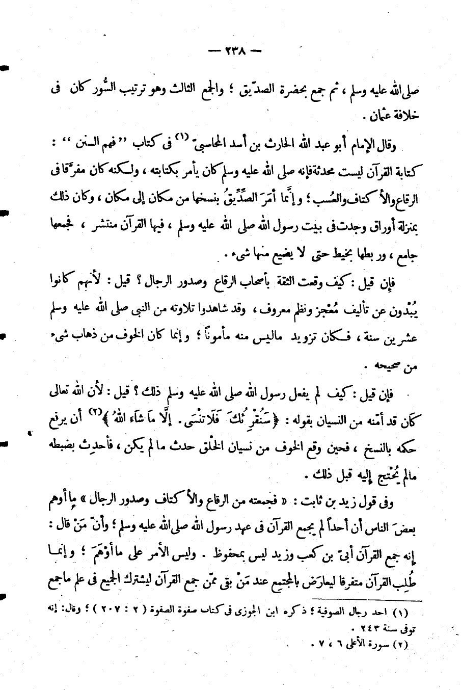 وَقَالَ الْإِمَامُ أَبُو عَبْدِ اللَّهِ الْحَارِثُ بْنُ أَسَدٍ الْمُحَاسِبِيُّ فِي كِتَابِ فَهْمِ السُّنَنِ كِتَابَةُ الْقُرْآنِ لَيْسَتْ مُحْدَثَةً فَإِنَّهُ صَلَّى اللَّهُ عَلَيْهِ وَسَلَّمَ كَانَ يَأْمُرُ بِكِتَابَتِهِ وَلَكِنَّهُ كَانَ مُفَرَّقًا فِي الرِّقَاعِ وَالْأَكْتَافِ وَالْعُسُبِ وَإِنَّمَا أَمَرَ الصِّدِّيقُ بِنَسْخِهَا مِنْ مَكَانٍ إِلَى مكان وَكَانَ ذَلِكَ بِمَنْزِلَةِ أَوْرَاقٍ وُجِدَتْ فِي بَيْتِ رَسُولِ اللَّهِ صَلَّى اللَّهُ عَلَيْهِ وَسَلَّمَ فِيهَا الْقُرْآنُ مُنْتَشِرٌ فَجَمَعَهَا جَامِعٌ وَرَبَطَهَا بِخَيْطٍ حَتَّى لَا يَضِيعَ مِنْهَا شَيْءٌ